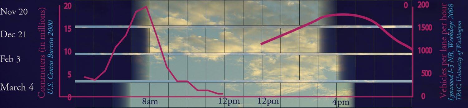 It is no secret that Seattle in the winter months does not experience an abundance of natural light: cities in the Puget Sound region make up 100% of the 15 cities in the U.S. with the lowest amount of sunlight per year3. As seen in Figure 1-5, the peak commute times between November and February – a full third of the year – fall in the dark or near-dark. By March, the daylight hours are considerably longer, but a substantial portion of workers are still commuting in pre-dawn and post-sunset murk.