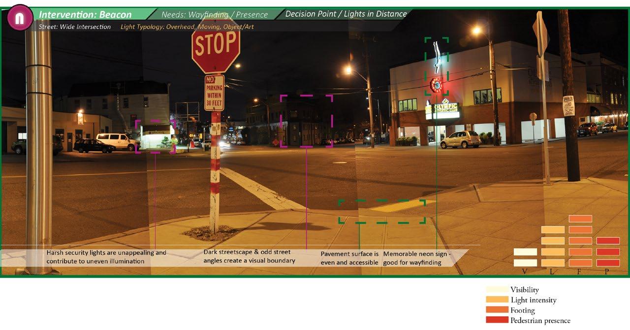 I also analyzed the photos according to perceived needs (e.g. wayfinding, social presence), street typology, lighting typology, key aspects of the site point (e.g. if a decision about direction needs to be made, if orienting features are visible from the point) and then proposed an intervention element (based on the components diagram shown in the previous chapter) that would be suitable for that site.