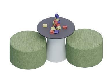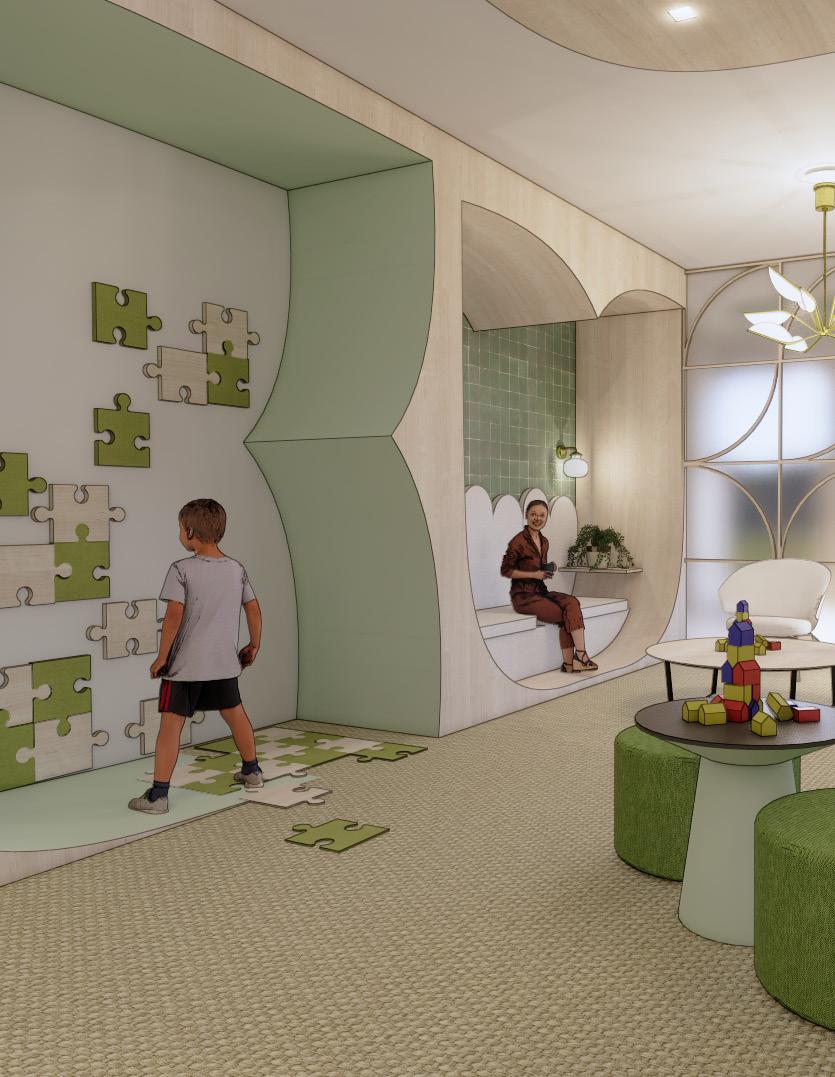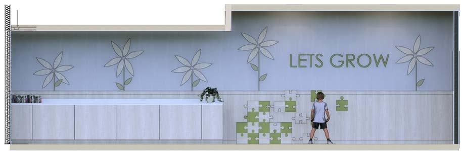 CUSTOM BUILT IN BOOTH SEATING AND PLAY AREA REPRESENT THE MAGNOLIA BLOSSOM. THE PLAY AREA HAS A MAGNETIC PUZZLE .