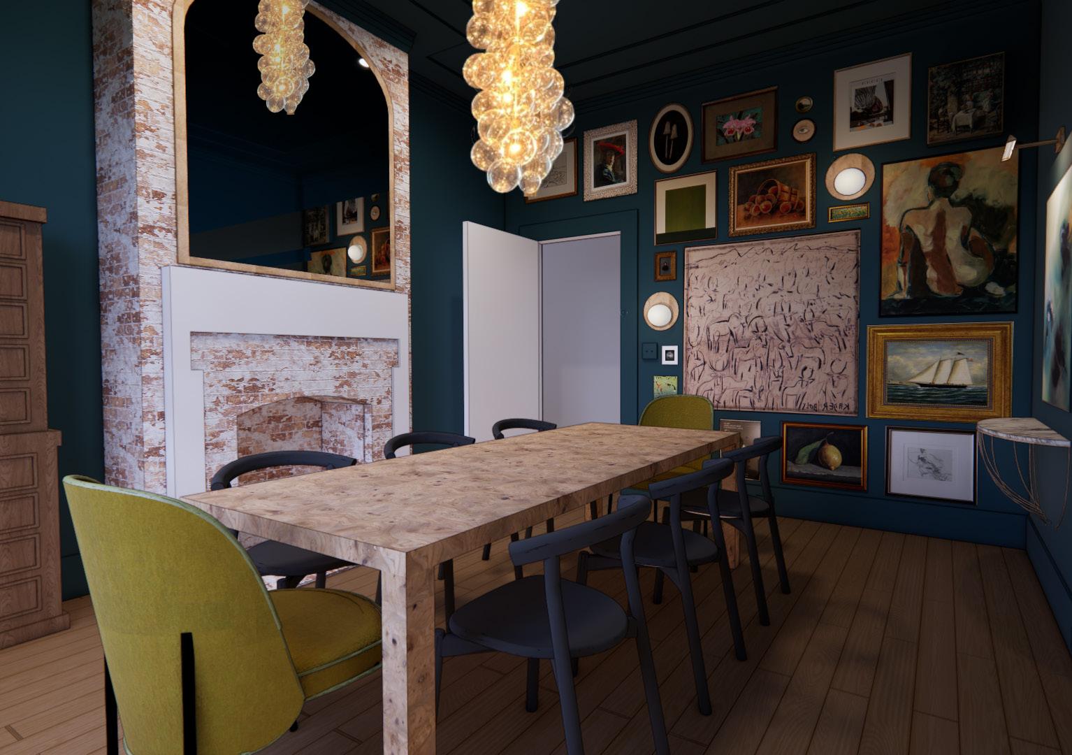 WHITE OAK WOOD PURPLE WALLPAPER WALLPAPER DARK GREEN FABRIC LIGHT GREEN FABRIC BISQUE FLOORING
