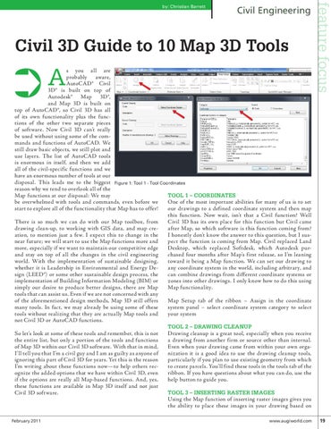 s you all are probably aware, AutoCAD® Civil 3D® is built on top of Autodesk® Map 3D®, and Map 3D is built on top of AutoCAD®, so Civil 3D has all of its own functionality plus the functions of the other two separate pieces of software. Now Civil 3D can’t really be used without using some of the commands and functions of AutoCAD. We still draw basic objects, we still plot and use layers. The list of AutoCAD tools is enormous in itself, and then we add all of the civil-specific functions and we have an enormous number of tools at our disposal. This leads me to the biggest Figure 1: Tool 1 - Tool Coordinates reason why we tend to overlook all of the Tool 1 – Coordinates Map functions at our disposal: We may One of the most important abilities for many of us is to set be overwhelmed with tools and commands, even before we our drawings to a defined coordinate system and then map start to explore all of the functionality that Map has to offer! this function. Now wait, isn’t that a Civil function? Well Civil 3D has its own place for this function but Civil came There is so much we can do with our Map toolbox, from after Map, so which software is this function coming from? drawing clean-up, to working with GIS data, and map creI honestly don’t know the answer to this question, but I susation, to mention just a few. I expect this to change in the pect the function is coming from Map. Civil replaced Land near future; we will start to use the Map functions more and Desktop, which replaced Softdesk, which Autodesk purmore, especially if we want to maintain our competitive edge chased four months after Map’s first release, so I’m leaning and stay on top of all the changes in the civil engineering toward it being a Map function. We can set our drawing to world. With the implementation of sustainable designing, any coordinate system in the world, including arbitrary, and whether it is Leadership in Environmental and Energy Decan combine drawings from different coordinate systems or sign (LEED®) or some other sustainable design process, the zones into other drawings. I only know how to do this using implementation of Building Information Modeling (BIM) or Map functionality. simply our desire to produce better designs, there are Map tools that can assist us. Even if we are not concerned with any Map Setup tab of the ribbon – Assign in the coordinate of the aforementioned design methods, Map 3D still offers system panel – select coordinate system category to select many tools. In fact, we may already be using some of these your system tools without realizing that they are actually Map tools and not Civil 3D or AutoCAD functions. Tool 2 – Drawing Cleanup Drawing cleanup is a great tool, especially when you receive So let’s look at some of these tools and remember, this is not a drawing from another firm or source other than internal. the entire list, but only a portion of the tools and functions Even when your drawing came from within your own orgaof Map 3D within our Civil 3D software. With that in mind, nization it is a good idea to use the drawing cleanup tools, I’ll tell you that I’m a civil guy and I am as guilty as anyone of particularly if you plan to use existing geometry from which ignoring this part of Civil 3D for years. Yet this is the reason to create parcels. You’ll find these tools in the tools tab of the I’m writing about these functions now—to help others recribbon. If you have questions about what you can do, use the ognize the added options that we have within Civil 3D, even help button to guide you. if the options are really all Map-based functions. And, yes, these functions are available in Map 3D itself and not just Tool 3 – Inserting Raster Images Civil 3D software. Using the Map function of inserting raster images gives you the ability to place these images in your drawing based on