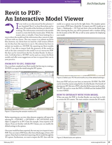 n my work as an educational facility planner, I use Autodesk® Revit® to draw floor plans and to create 3D models of the facilities on which I am working. The information contained in the models is used to create the facility master plan. While the master plan is valuable, I have been looking for a way to share the models and the information they contain in digital form with my clients. The easy answer is to submit my Revit files; however, my clients have no need for a full version of Revit nor do they have the expertise to use it. My solution has been to submit my models as a 3D PDF. By exporting my Revit models to IFC, I am able to import both the geometry of the model as well as the data contained in the model in to an interactive PDF file that can be viewed from the free Acrobat Reader. In this article, I will show how a 3D PDF can be used as a viewer for Revit models and offer some suggestions on how to expand their use in your practice.