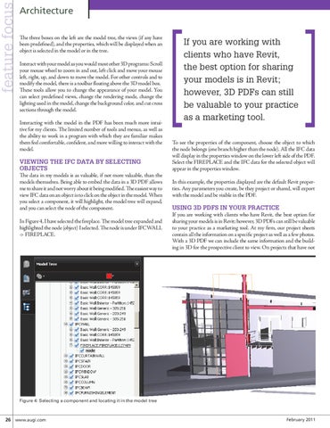 If you are working with clients who have Revit, the best option for sharing your models is in Revit; however, 3D PDFs can still be valuable to your practice as a marketing tool. To see the properties of the component, choose the object to which the node belongs (one branch higher than the node). All the IFC data will display in the properties window on the lower left side of the PDF. Select the FIREPLACE and the IFC data for the selected object will appear in the properties window. In this example, the properties displayed are the default Revit properties. Any parameters you create, be they project or shared, will export with the model and be visible in the PDF.