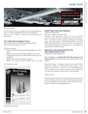 EastCoast CAD/CAD: BIMLink EastCoast CAD/CAM http://www.eccadcam.com/index.shtml Overview: “MEP Fabrication Version 1.0 uses the EastCoast patented “Design to Fabrication“ workflow to provide sheet metal contractors and engineers with an elegant, yet simple process that takes generic engineering models, in Autodesk Revit MEP or AutoCAD MEP, and automatically converts their HVAC system layouts to real manufacturer geometry and specifications to create fabricationreadied AutoCAD MEP drawing.” BIM Apps: API Applications for Autodesk’s BIM Tools A blog: http://bimapps.typepad.com/ Note: This Blog is in a trial period and will continue or not based on the interest of its readers. Visit today and show your support. From the first post: “…a blog that’s devoted to the many API-based applications available for Autodesk BIM software products. In so doing, I hope to provide a resource for users of Autodesk BIM tools and raise awareness for the really exciting array of technologies that are produced by Autodesk developer partners and individuals.” Until next issue! If you have some news to share with us for future issues, please let us know. Likewise, if you are a user of a featured product or news item and would like to write a review, we want to hear from you. Contact the editor: steve.stafford@augi.com