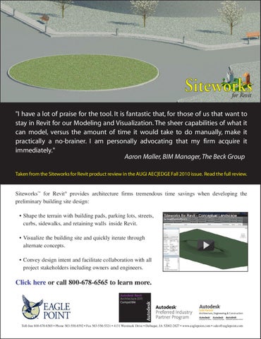 "I have a lot of praise for the tool. It is fantastic that, for those of us that want to stay in Revit for our Modeling and Visualization. The sheer capabilities of what it can model, versus the amount of time it would take to do manually, make it practically a no-brainer. I am personally advocating that my firm acquire it immediately." Aaron Maller, BIM Manager, The Beck Group Taken from the Siteworks for Revit product review in the AUGI AEC|EDGE Fall 2010 issue. Read the full review.