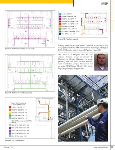 I set up a view with a pipe legend. I was able to use this to help size pipe based off the 2006 International Plumbing Code Figure E103.3(3) Friction Loss in Smooth Pipe (see Figure 10). Phil Pleiss is a Designer with the Mechanical Facilities Group at Merrick & Company in Denver, Colorado. He works primarily with Revit MEP. He is an Autodesk Revit Architecture Certified Professional and an active AUGI Forum Member. His blog is http://mep-bim-guru.blogspot.com/.