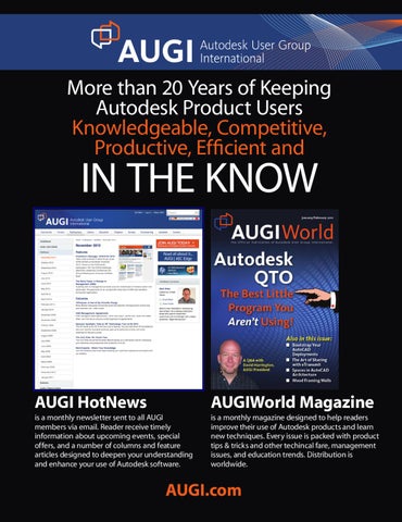 is a monthly newsletter sent to all AUGI members via email. Reader receive timely information about upcoming events, special offers, and a number of columns and feature articles designed to deepen your understanding and enhance your use of Autodesk software.