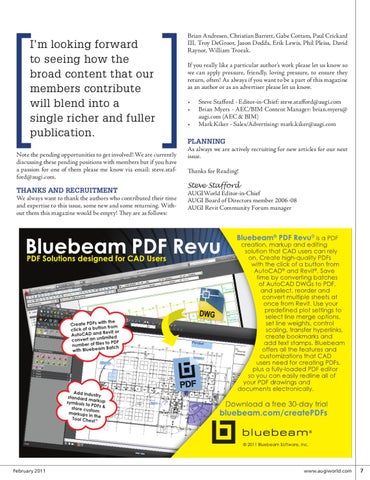 Steve Stafford - Editor-in-Chief: steve.stafford@augi.com Brian Myers - AEC/BIM Content Manager: brian.myers@ augi.com (AEC & BIM) Mark Kiker - Sales/Advertising: mark.kiker@augi.com