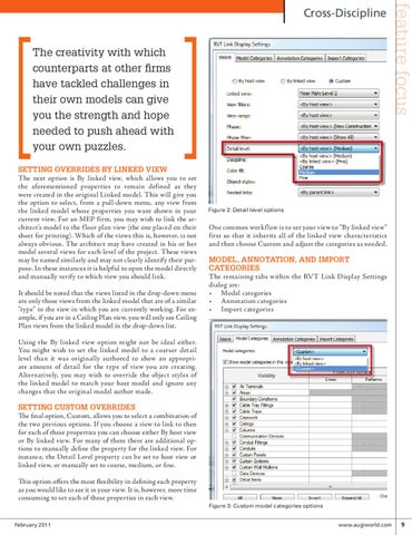 Setting Custom overrides The final option, Custom, allows you to select a combination of the two previous options. If you choose a view to link to then for each of these properties you can choose either By host view or By linked view. For many of them there are additional options to manually define the property for the linked view. For instance, the Detail Level property can be set to host view or linked view, or manually set to coarse, medium, or fine. This option offers the most flexibility in defining each property as you would like to see it in your view. It is, however, more time consuming to set each of these properties in each view. Figure 3: Custom model categories options February 2011