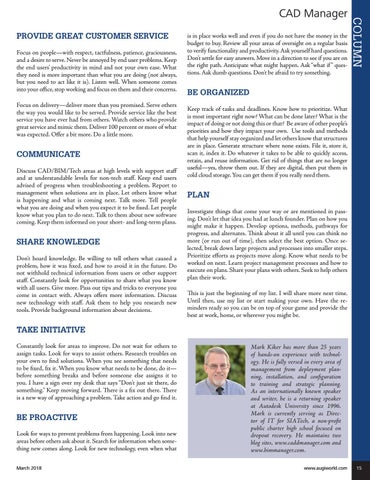 COMMUNICATE Discuss CAD/BIM/Tech areas at high levels with support staff and at understandable levels for non-tech staff. Keep end users advised of progress when troubleshooting a problem. Report to management when solutions are in place. Let others know what is happening and what is coming next. Talk more. Tell people what you are doing and when you expect it to be fixed. Let people know what you plan to do next. Talk to them about new software coming. Keep them informed on your short- and long-term plans.