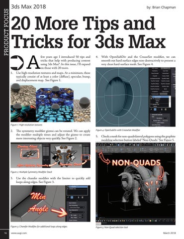20 More Tips and Tricks for 3ds Max A few years ago I introduced 50 tips and tricks that help with producing content using 3ds Max®. In this issue, I’ll expand on those with 20 more.