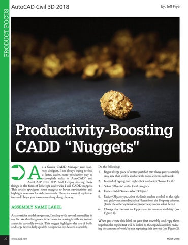 s a Senior CADD Manager and roadway designer, I am always trying to find a faster, easier, more productive way to accomplish tasks in AutoCAD® and AutoCAD® Civil 3D®. And I enjoy sharing those things in the form of little tips and tricks I call CADD nuggets. This article spotlights some nuggets to boost productivity and highlight new uses for old commands. These are some of my favorites and I hope you learn something along the way.