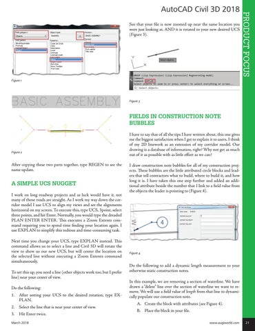 A SIMPLE UCS NUGGET I work on long roadway projects and as luck would have it, not many of those roads are straight. As I work my way down the corridor model I use UCS to align my views and set the alignments horizontal on my screen. To execute this, type UCS, 3point, select three points, and hit Enter. Normally, you would type the dreaded PLAN ENTER ENTER. This executes a Zoom Extents command requiring you to spend time finding your location again. I use EXPLAN to simplify this tedious and time-consuming task. Next time you change your UCS, type EXPLAN instead. This command allows us to select a line and Civil 3D will rotate the view to show us our new UCS, but will center the location on the selected line without executing a Zoom Extents command simultaneously. To set this up, you need a line (other objects work too, but I prefer line) near your center of view. Do the following: 1. After setting your UCS to the desired rotation, type EXPLAN. 2. Select the line that is near your center of view. 3. Hit Enter twice.
