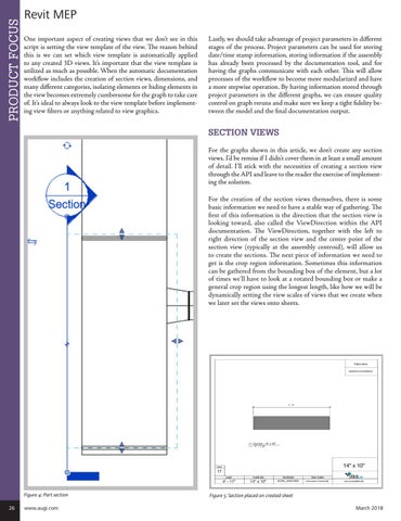 SECTION VIEWS For the graphs shown in this article, we don’t create any section views. I’d be remiss if I didn’t cover them in at least a small amount of detail. I’ll stick with the necessities of creating a section view through the API and leave to the reader the exercise of implementing the solution. For the creation of the section views themselves, there is some basic information we need to have a stable way of gathering. The first of this information is the direction that the section view is looking toward, also called the ViewDirection within the API documentation. The ViewDirection, together with the left to right direction of the section view and the center point of the section view (typically at the assembly centroid), will allow us to create the sections. The next piece of information we need to get is the crop region information. Sometimes this information can be gathered from the bounding box of the element, but a lot of times we’ll have to look at a rotated bounding box or make a general crop region using the longest length, like how we will be dynamically setting the view scales of views that we create when we later set the views onto sheets.