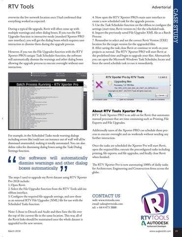 overwrite the live network location once I had confirmed that everything worked as expected. During a typical file upgrade, Revit will often come up with multiple warnings and other dialog boxes. If you run the File Upgrader function in interactive mode (standard Xporter PRO user interface), you will get the dialog boxes which requires user interaction to dismiss them during the upgrade process. However, if you run the File Upgrader function with the RTV Xporter PRO’s unique Task Scheduler function, the software will automatically dismiss the warnings and other dialog boxes allowing the upgrade process to execute overnight without user interaction.