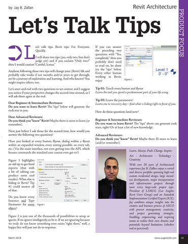 Tip 01: Touch every button and flyout Learn the tool you spend a predominant part of your life using. Tip 02: Learn the parameters! Learn one to ten every day—find what is hiding right in front of you. How do these questions land now? Beginner & Intermediate Reviteurs: Do you want to learn Revit? The “tips” above can generate rock stars, right? Or at least a lot of new knowledge. Advanced Reviteurs: Do you think you “know” Revit? Maybe there IS more to learn (and/or remember). Learn. Always. Push. Change. Inspire. Art - Architecture - Technology Creativity With over 20 years of Architectural experience Jay B. Zallan enjoys a varied and diverse portfolio spanning high-end custom residential design, large mixeduse developments, major transportation and infrastructure projects through most every large-scale project type. President of LARUG (Los Angeles Revit Users Group) and an Autodesk Implementation Certified Expert (ICE), Jay combines unique insights into the creative and business process of AECO with proven management, creativity, and project generating strategies. Enabling, empowering, and inspiring teams to realize their own dreams and potentials beyond limitations (whether real or perceived). www.augiworld.com 35