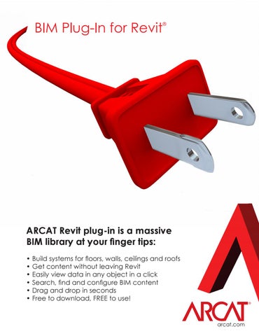 ARCAT Revit plug-in is a massive BIM library at your finger tips: • Build systems for floors, walls, ceilings and roofs • Get content without leaving Revit • Easily view data in any object in a click • Search, find and configure BIM content • Drag and drop in seconds • Free to download, FREE to use!
