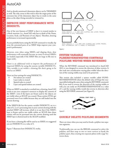 IMPROVE XREF PERFORMANCE WITH INDEXCTL One of the nice features of XREF is that it is treated similar to a block insertion (i.e., AutoCAD only has to think of the Name, Location, Scale, and Rotation of one object). Therefore, drawing performance is increased exponentially. As you probably know, using the XCLIP command to visually clip away the unwanted parts of an XREF helps improve your computer’s performance. However, even when using XREFs and clipping them, slow performance will eventually become an issue if several XREFs are loaded (especially if the XREF files are large in file size to begin with). There is an additional trick to improve the performance of imported XREFs by using the system variable INDEXCTL. This variable is set within a drawing file that’s going to be used as an XREF. There are four settings for using INDEXCTL: 0 No indexes are created 1 Layer index is created 2 Spatial index is created 3 Layer and spatial indexes are created When an XREF is attached or overlaid into a drawing, AutoCAD needs to use your computer’s resources to display the contents of the XREF—even if the layers are frozen and/or the objects are not visible when an XCLIP was created. Those entities STILL get processed even if not visible because they are still loaded into the current drawing.