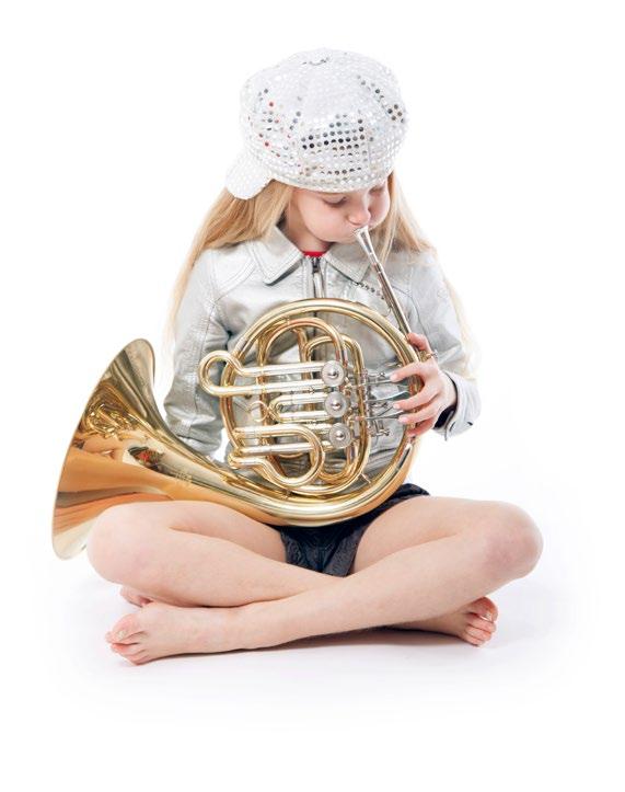 Brass instruments are shiny and made of metal. You play them by buzzing your lips into a mouthpiece— like making a silly “brrrr” sound! The sound from brass instruments comes out of a large opening called a bell.