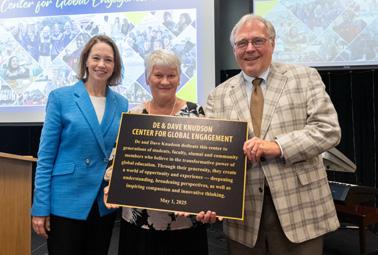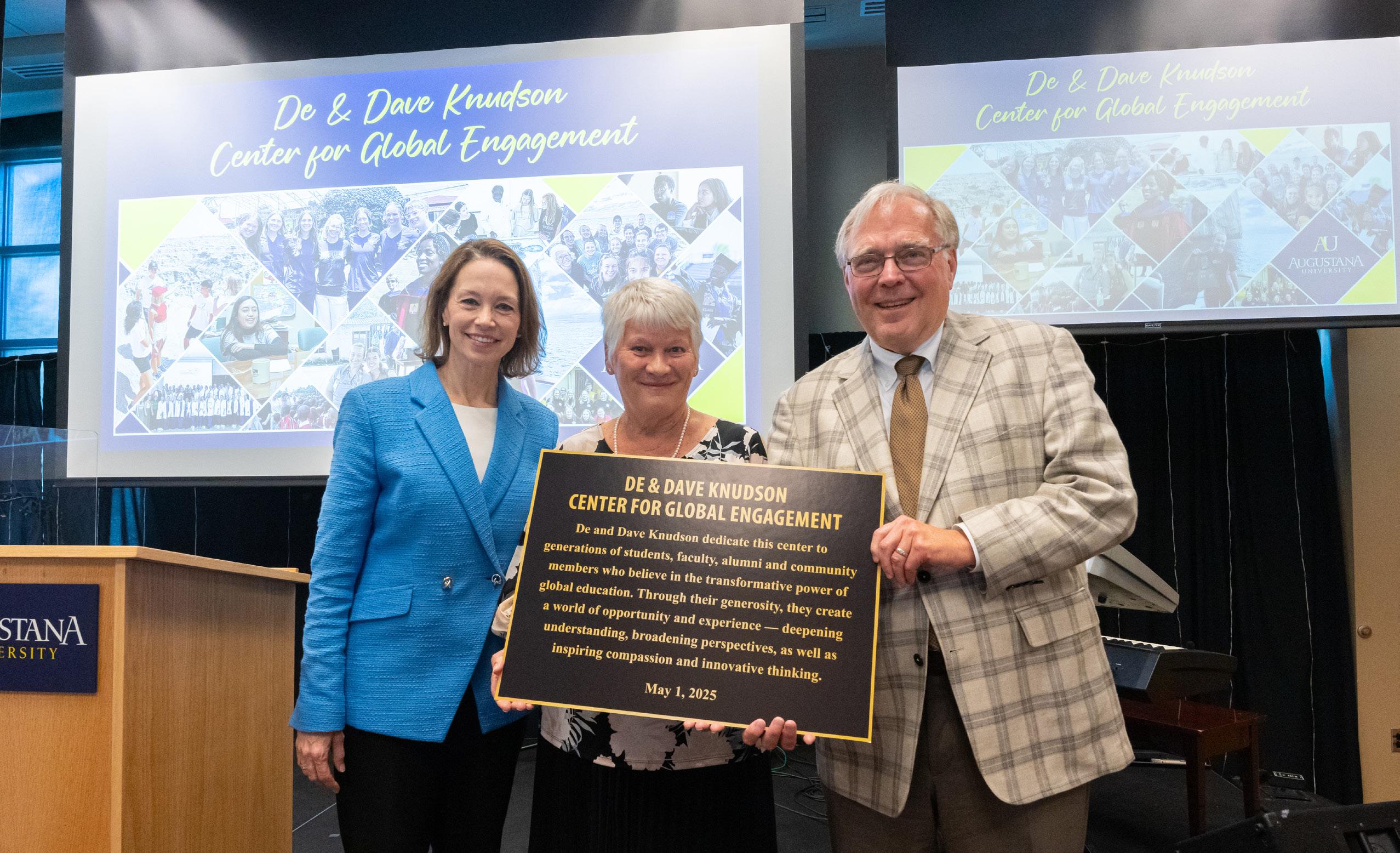 As part of a ceremony in Spring 2025, Augustana University dedicated the De & Dave Knudson Center for Global Engagement — previously known as the International Programs Office (IPO). The transition comes after the Knudsons presented the university with a $1 million matching gift.
