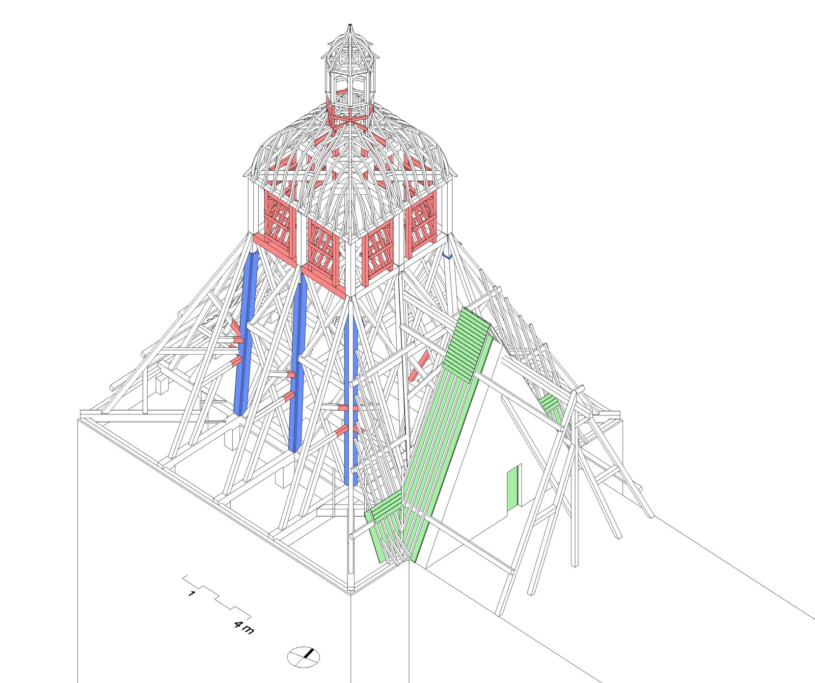 Ce modèle a permis d’indiquer les pièces de charpente à remplacer et les ajouts à faire en matière de protection incendie.