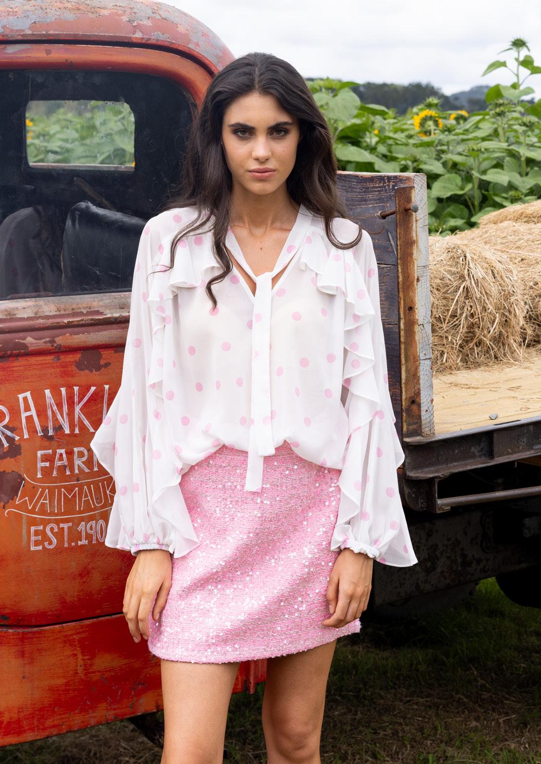 Tylie Shirt Satin Pine $159.99 Romy Skirt Sequin Black $149.99
