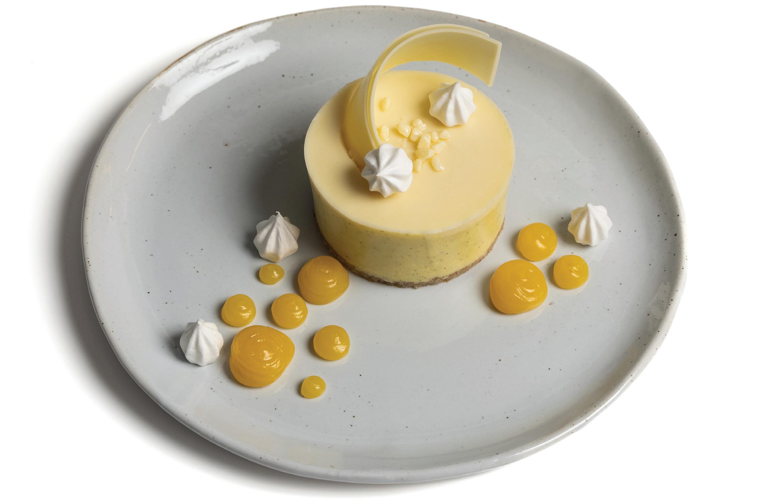 A yuzu and citrus cheesecake-style mousse resting delicately on a genoise sponge base, crowned with velvety white chocolate ganache and sprinkled with white chocolate chips.