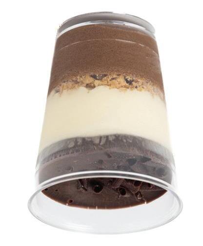 Alternating layers of vegan dark chocolate mousse and fresh raspberry coulis. Topped with dark chocolate chips. Suitable for non-gluten and vegan diets.