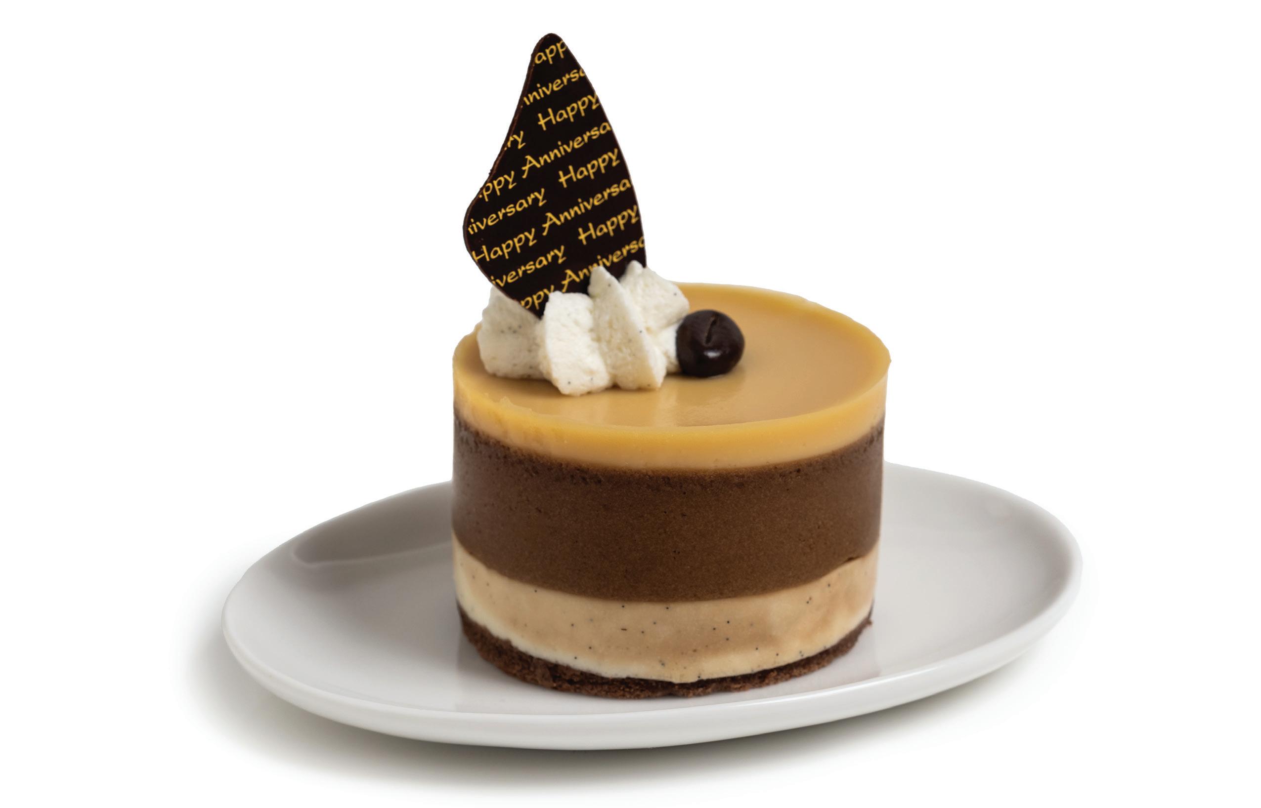 A base of chocolate genoise sponge with vanilla cheesecake and rich mocha mousse, studded with roasted cacao nibs. This is topped with a rich, dairy caramel ganache and a decorative chocolate coffee bean.
