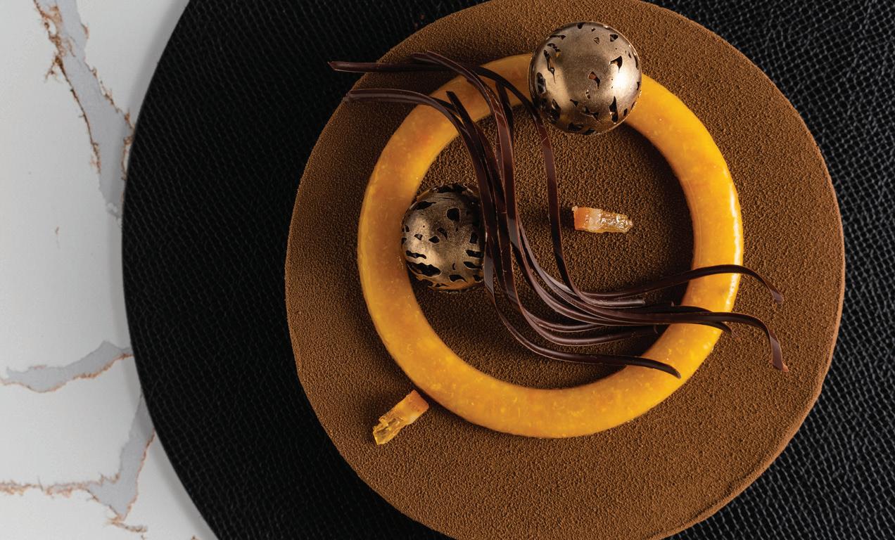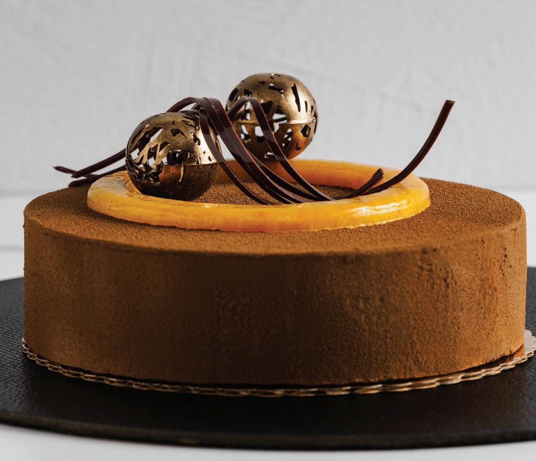 Unmold the Vanilla Crème and the Clementine Gelée. Build the entremets a inside 8-inch ring. Spread an even layer of Chocolate Mousse on top of the Black Cocoa Streusel, then press in a layer of the Chocolate Almond Cake. Spread another layer of the Chocolate Mousse, press in the Vanilla Crème, then the Clementine Gelee. Spread a layer of Chocolate Mousse to the top of the ring and scrape clean then freeze. Unmold entremets and spray with the Milk Chocolate Velvet Spray. Place the Clementine Gelée on top and decorate as desired.