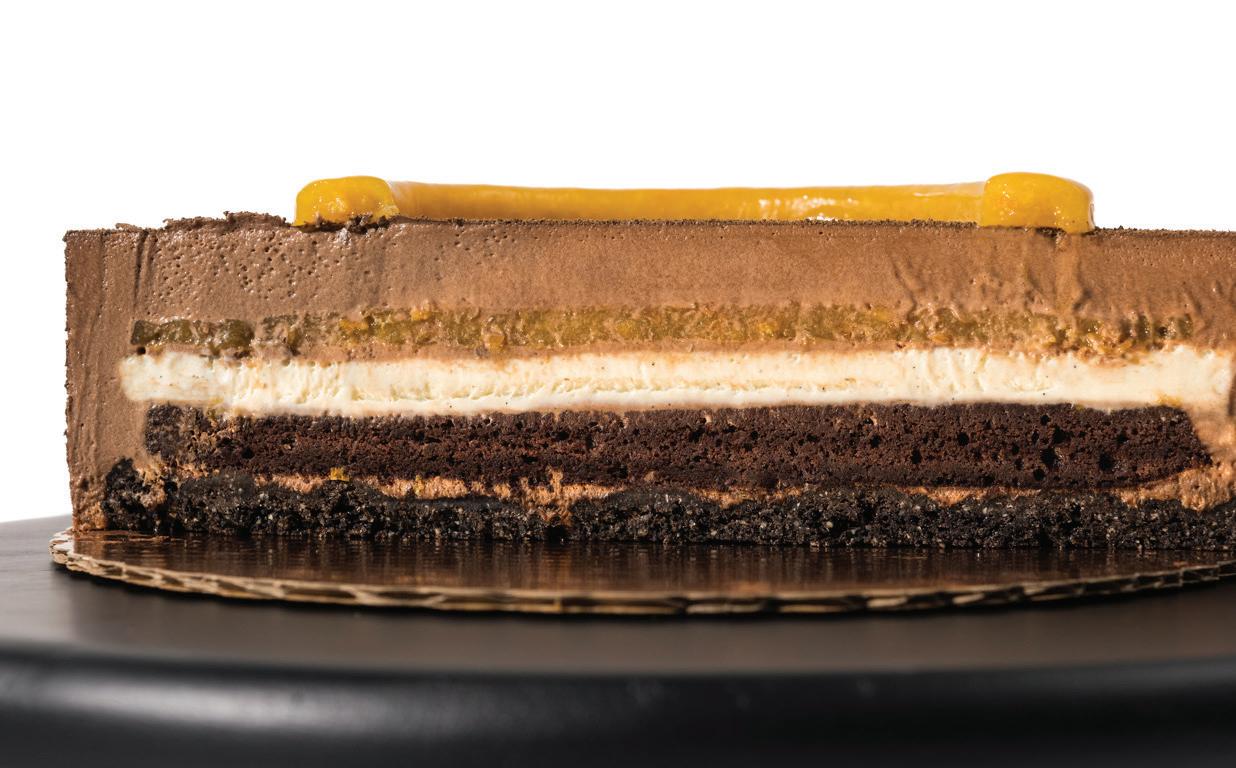 Melt the cocoa paste and butter together and set aside. In a separate bowl, sift together the cocoa powder and flour. In the bowl of a stand mixer, fitted with a whisk attachment, whip the almond paste, first amount of sugar, eggs, and egg yolks to ribbon stage. In a separate bowl of a stand mixer, fitted with a whisk attachment, whip the egg whites and the second amount of sugar to form a medium-peak meringue. Fold the meringue into the egg yolk mixture in three stages. Then, fold in the sifted dry ingredients. Lastly, fold in the cocoa paste mixture. Spread the batter onto two half-sheet pans, lined with parchment paper, and bake at 350˚F/176˚C for 8 to 10 minutes, or until done. Allow to cool, then cut out 9-inch round cake pieces.