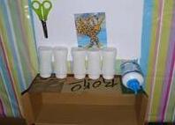 Necesitamos: Caja de cartón, botes pequeños de plástico (de yogurt bebido u otro), cola blanca de carpin tero, tijeras, imágenes impresas de animales (alternativa: hojas blancas y lápices de colores). Pelota (alternativa: si tienes plastilina que se te ha puesto dura o sucia puedes hacer una pelota. Tiene la ventaja de que no rebota y puedes jugar en una mesa sin romper nada)