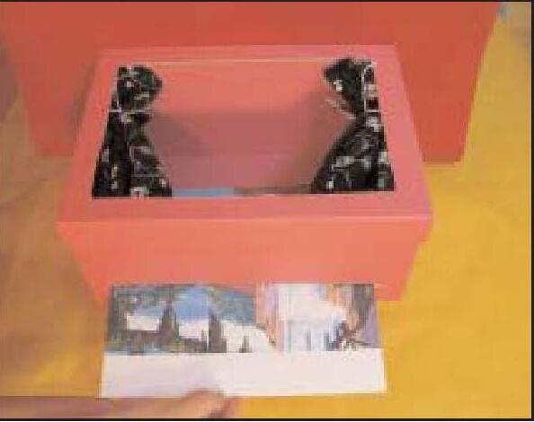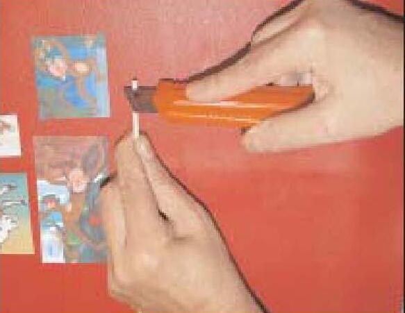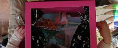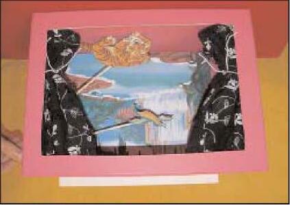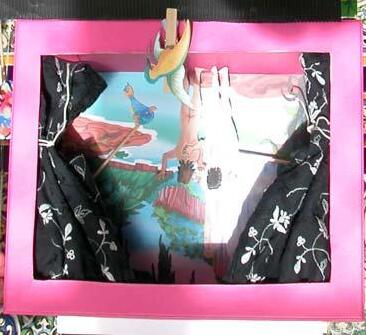 Cómo hacerlo (cont.): 5. Pegar a los palillos las figuras que están en la lámina u otras figuras que hayas seleccionado. Aconsejamos pegar por la parte de atrás un papel para reforzar el pegado del palillo a la figura. 6. Introduciendo los palillos con las figuras por las ranuras laterales, ya puedes escenificar el relato. Poner cortinas es opcional, puedes hacerlo atando una cuerda a los laterales de la caja y haciendo un dobladillo en la tela grapado. Para abrir las cortinas simplemente hay que atarlas con un cordón o lana.