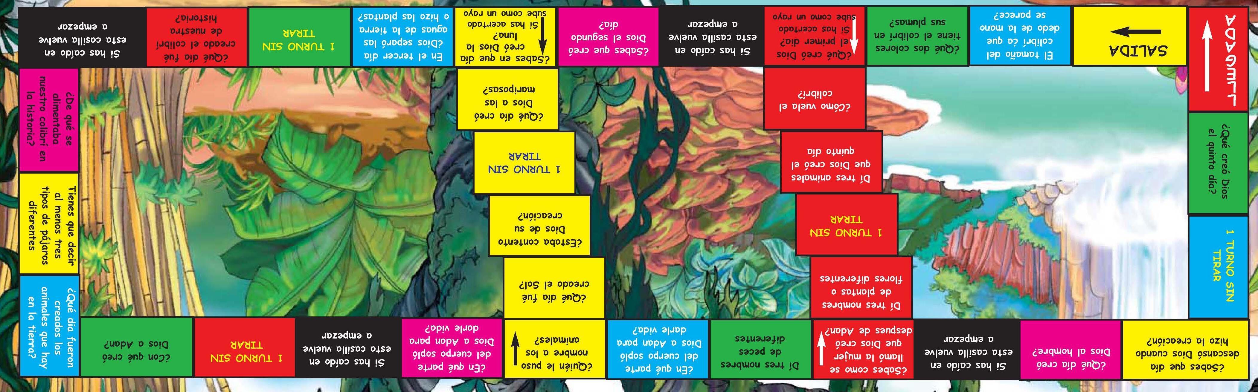 Proponemos: Se les explica a los niños que los animales (fichas) se han perdido en el bosque y tenemos que ayudarles a encontrar la salida, para ello hay que responder a las preguntas. Previamente se debe leer el relato bíblico: El primer colibrí. Posteriormente se inicia el juego. Se tira el dado y se avanza en las casillas según el número que ha salido en la cara del dado. Se debe responder a la pregunta para poder seguir tirando. Si respondes mal pasas el turno al siguiente jugador. Puedes llegar antes si caes en la casilla que presenta un atajo, siempre y cuando respondas correctamente a la pregunta. Puedes caer en la casilla de “pasar un turno sin tirar”. Finaliza el juego cuando todos han llegado a la meta.