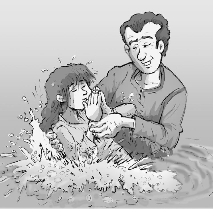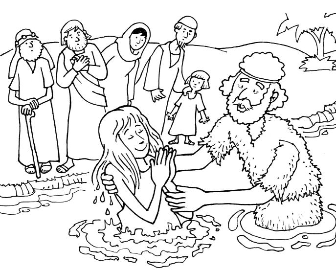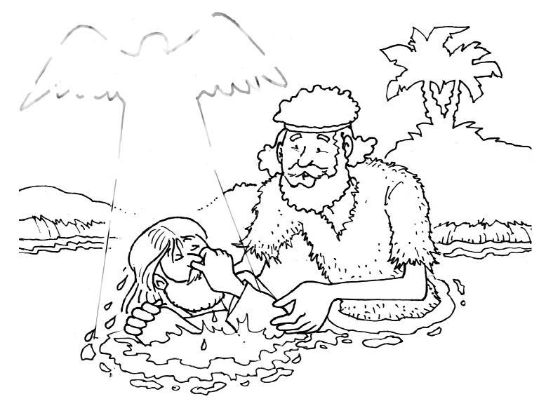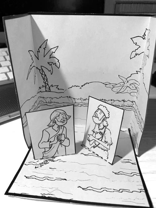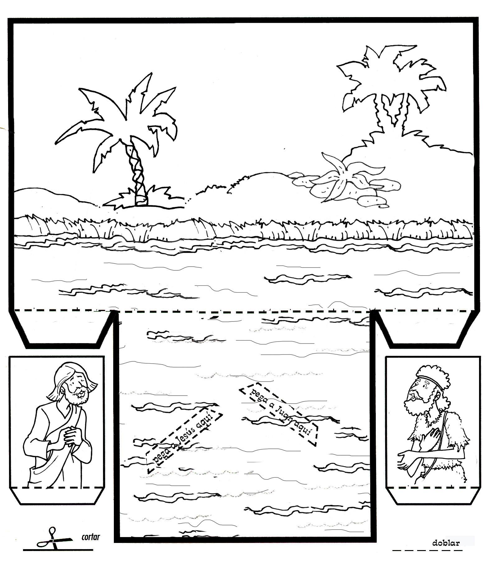 Coloread, recortad y pegad las piezas en su lugar. Juega a doblar las figuras hacia atrás como si Jesús estuviera siendo sumergido.