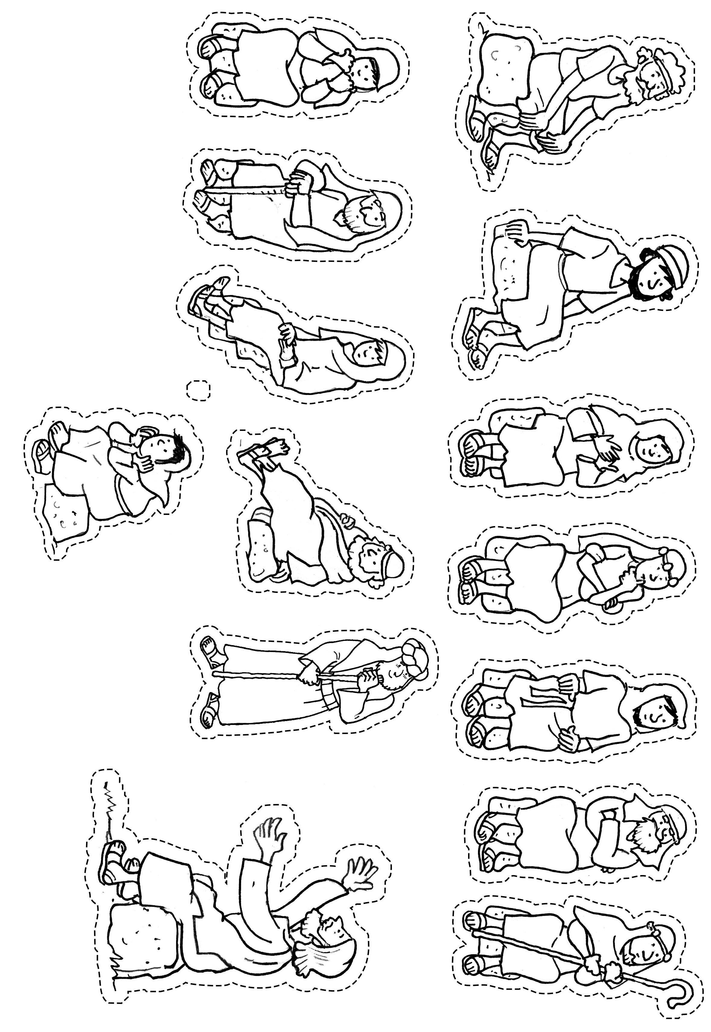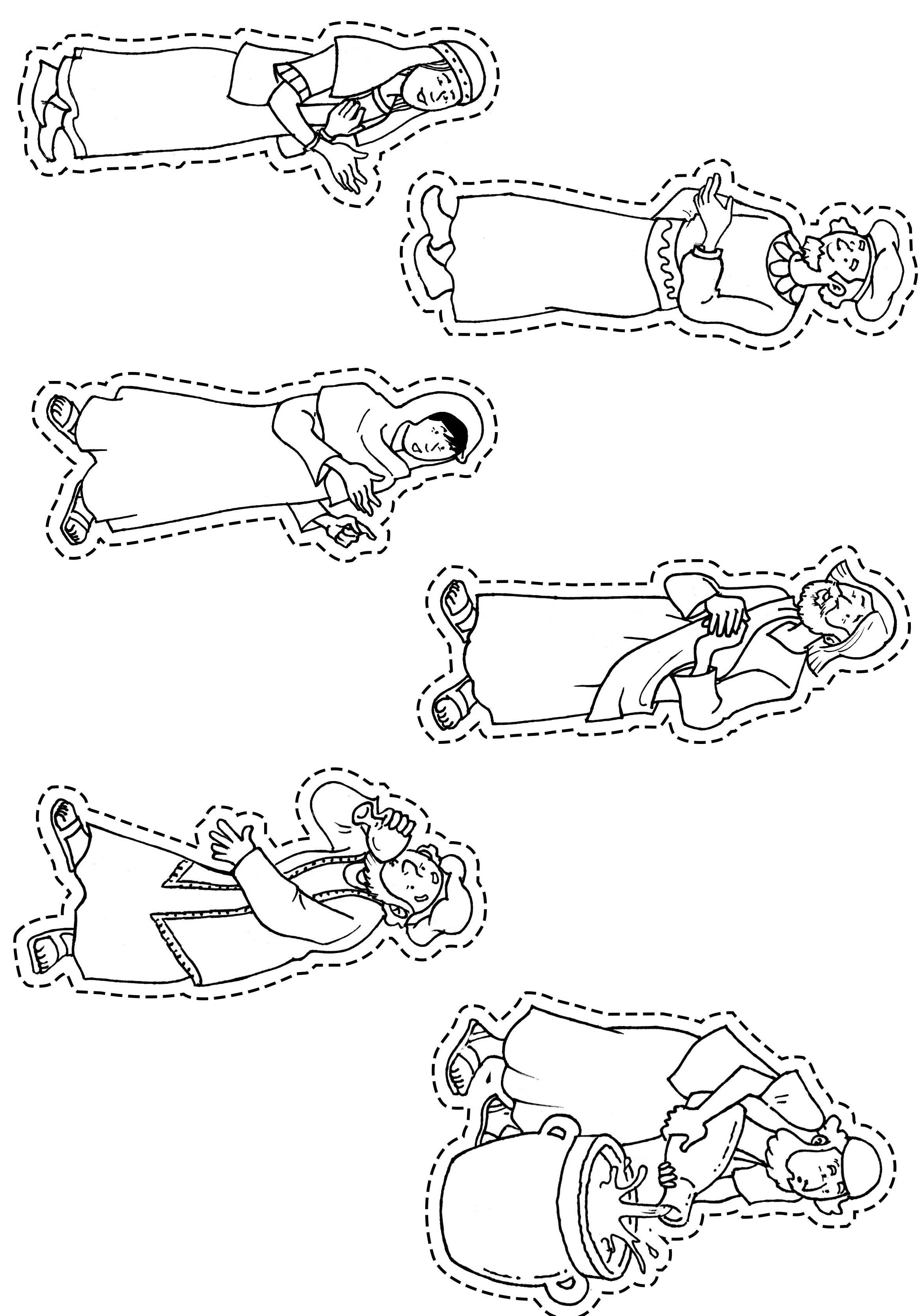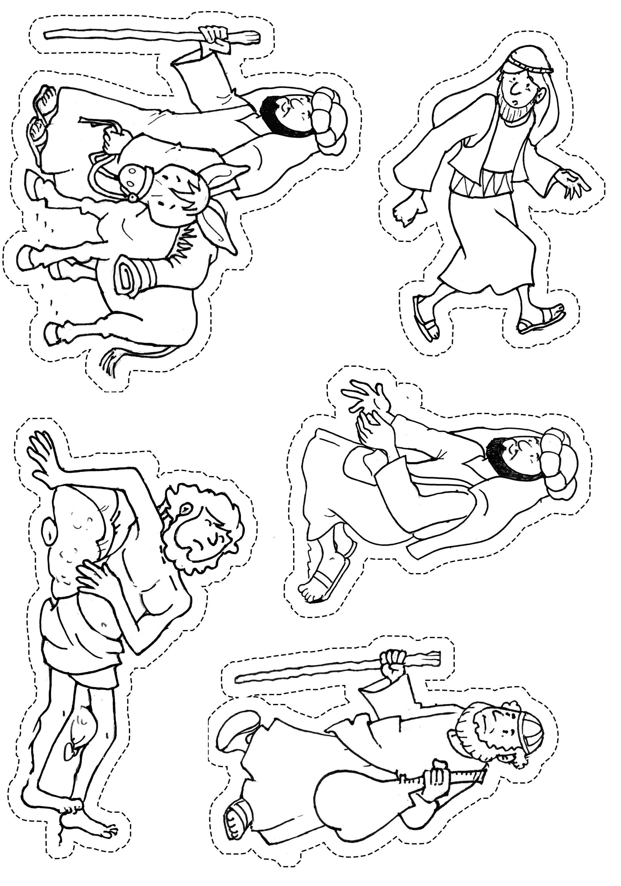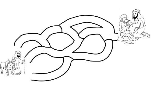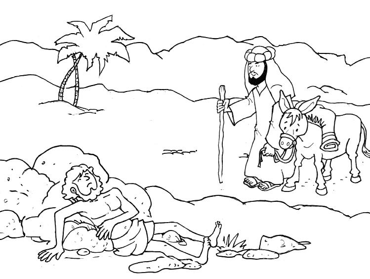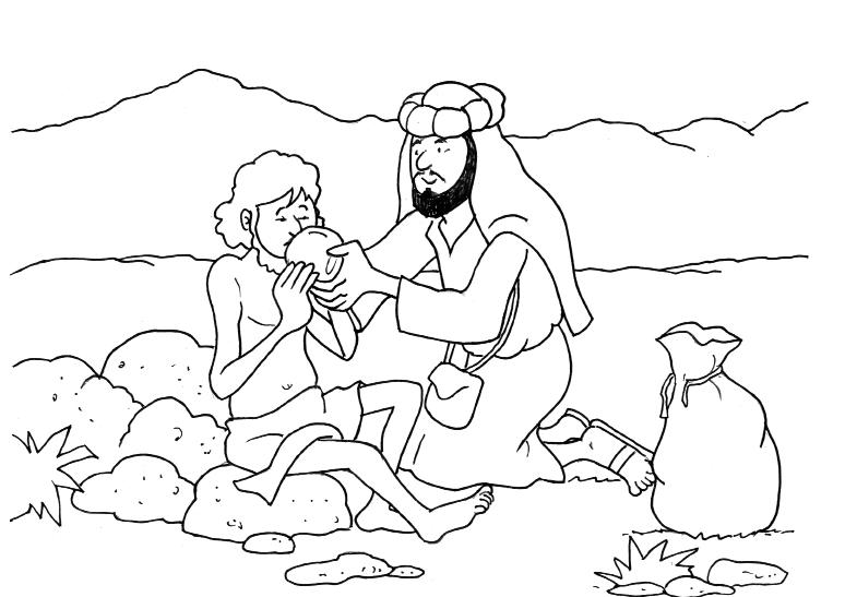 Unpoco más tarde, otro hombre venía con su burro por el camino. Era un samaritano. Los samaritanos eran extranjeros. El extranjero vio al hombre del suelo. Se acercó. No lo conocía de nada, pero al verlo con tantos golpes, decidió que debía ayudarlo. Primero, le dio un poco de agua para beber. Luego le curó las heridas y se las vendó. Después buscó entre su equipaje algo de ropa y le ayudó a ponérsela.