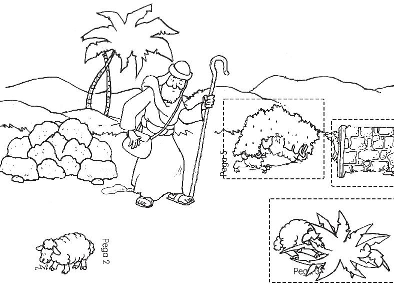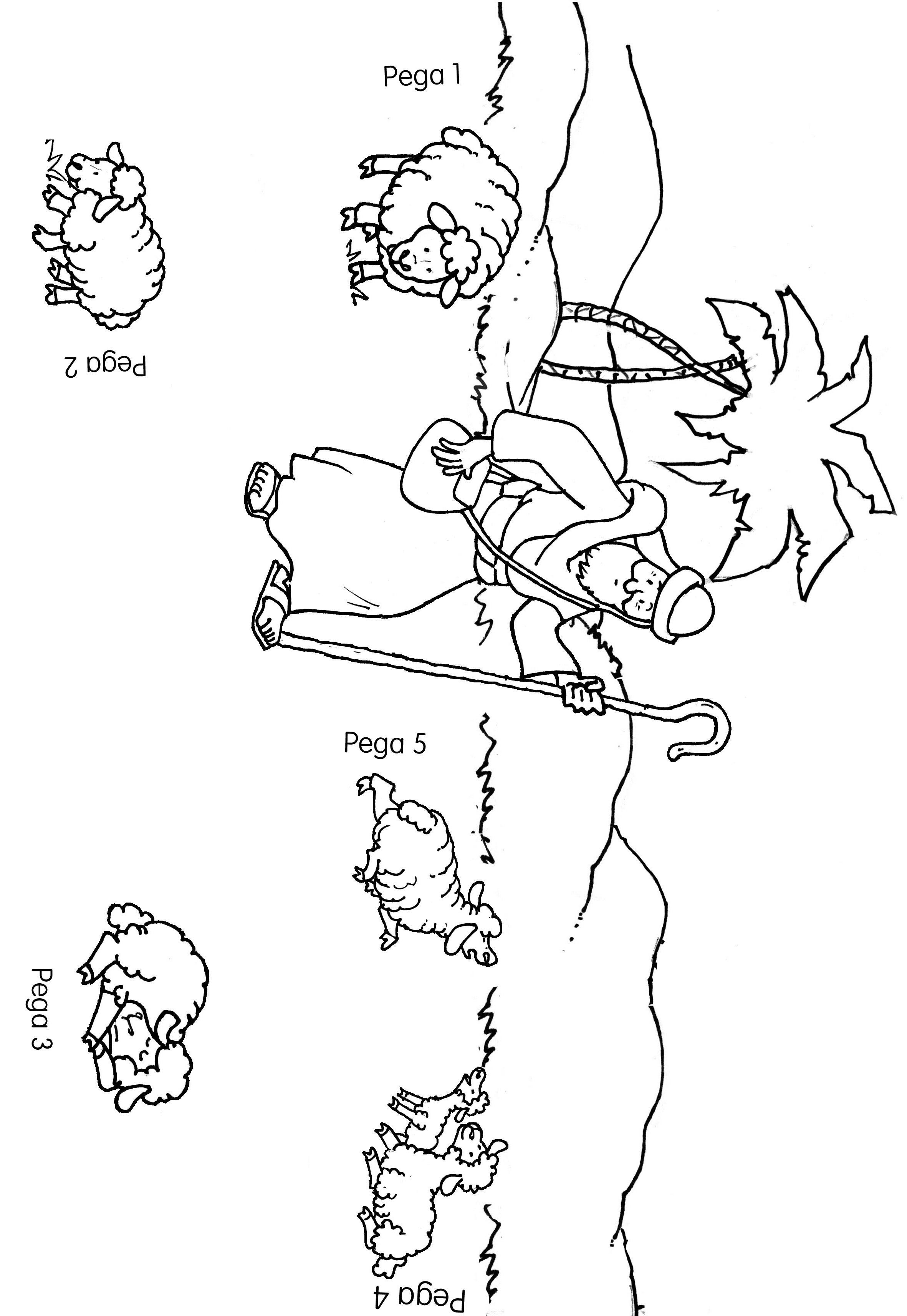 Colorea el fondo con el pastor y las ovejas. Colorea las solapas y recórtalas. Pega la solapa en el lugar indicado poniendo pegamento solo sobre las letras «Pega X». Así cuando levantéis las solapas aparecerán las ovejas perdidas.