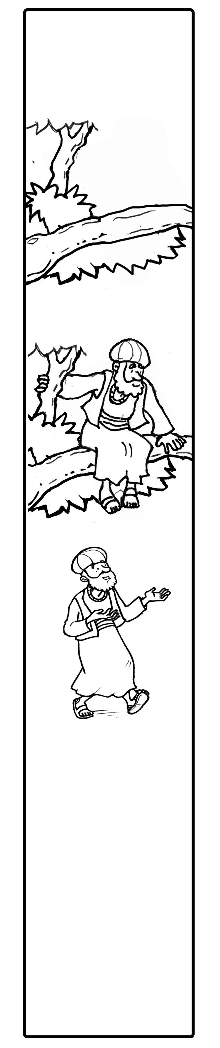 Entonces, a Zaqueo se le ocurrió una idea. Cerca de allí había un árbol muy grande, un sicomoro. Los sicomoros son árboles que tienen el tronco muy retorcido y unas ramas muy fuertes. Era muy fácil subir al sicomoro. Zaqueo pensó que si se subía al árbol podría ver a Jesús bien cerca. Así que Zaqueo, se subió al árbol, y allí, sentado en una de sus ramas, esperó a que Jesús pasara y así poder verlo.