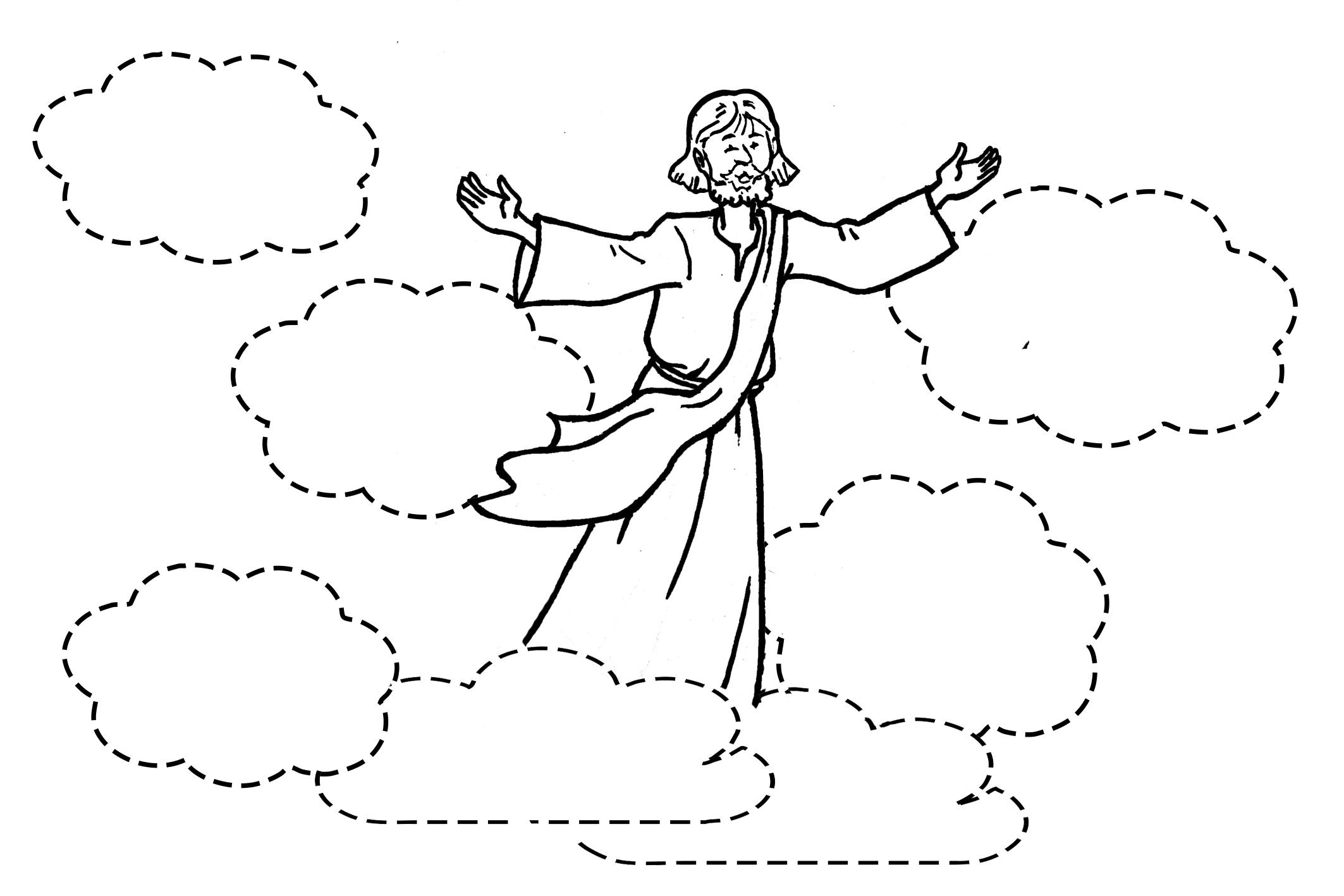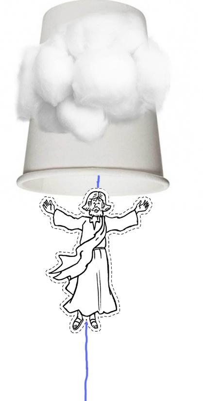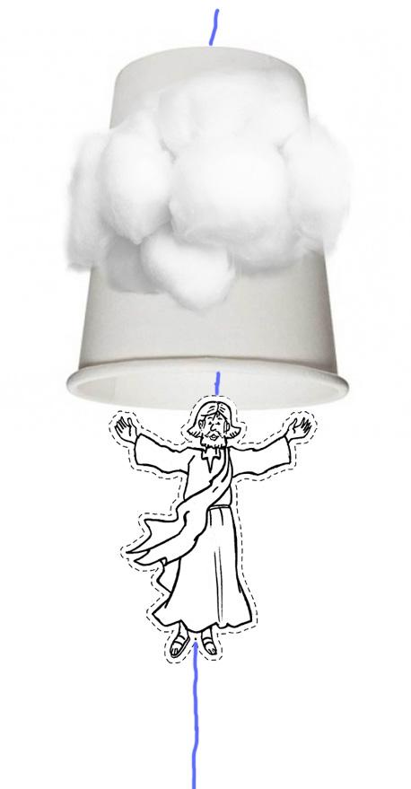 Decora el vaso con algodón como si fueran nubes. Haz un agujerito en el fondo del vaso del tamaño del cordel que quieras pasar y pasa el cordel. Pega el cordel a la figura de Jesús por detrás con adhesivo (celo, pegamento...) de forma que sobre bastante hilo tanto por debajo como por encima. Tirando del cordel hacia arriba Jesús «ascenderá» al cielo y desaparecerá dentro del vaso. Tirando del cordel hacia abajo, Jesús descenderá de nuevo en su segunda venida.