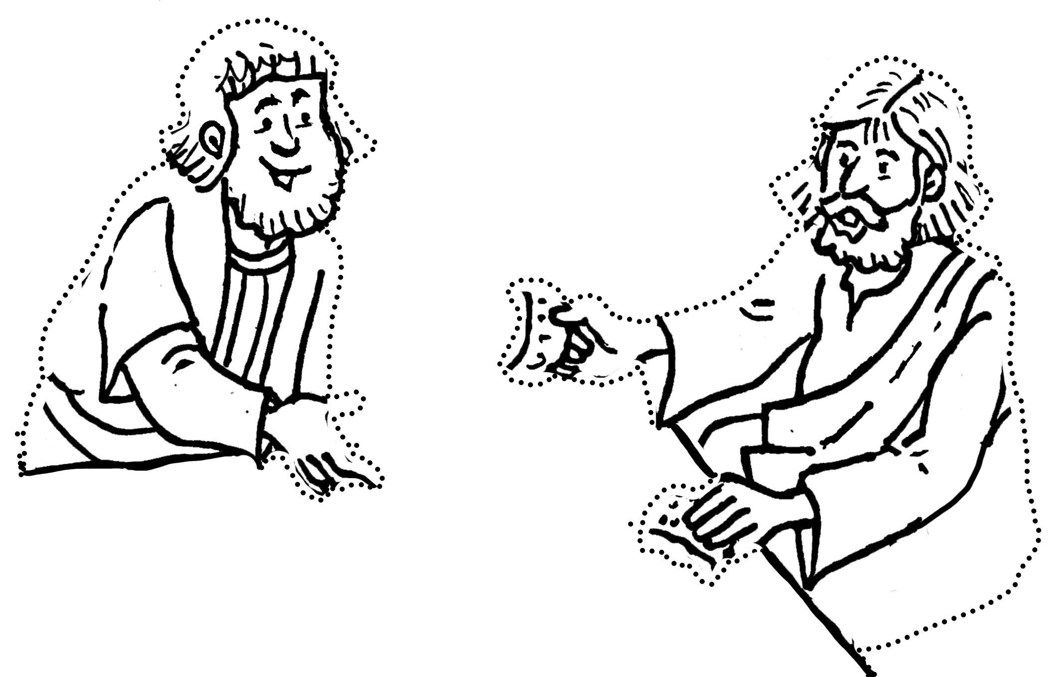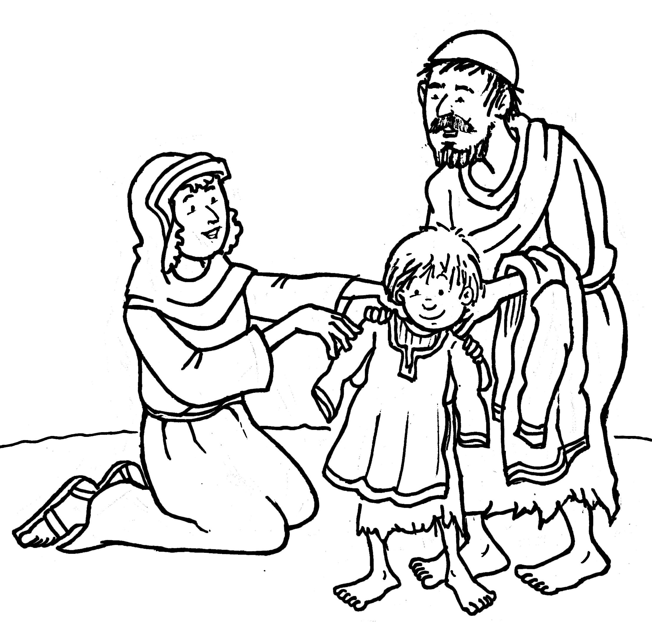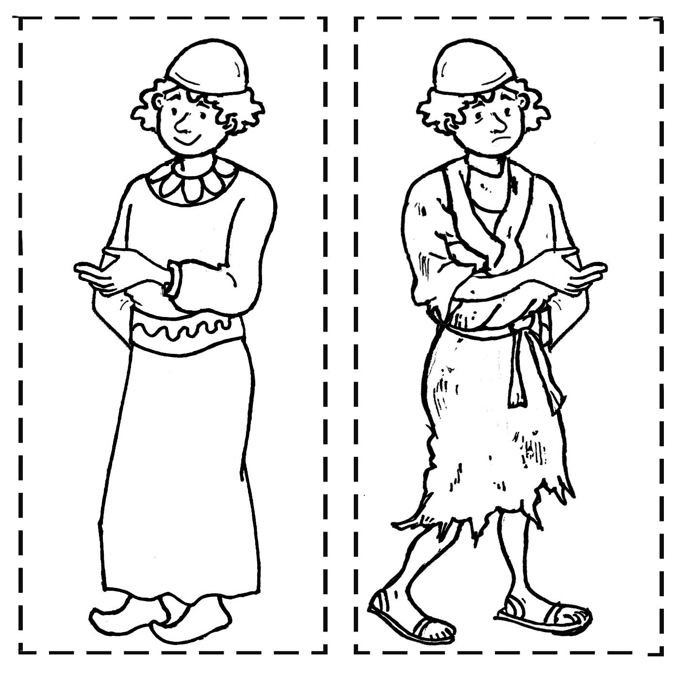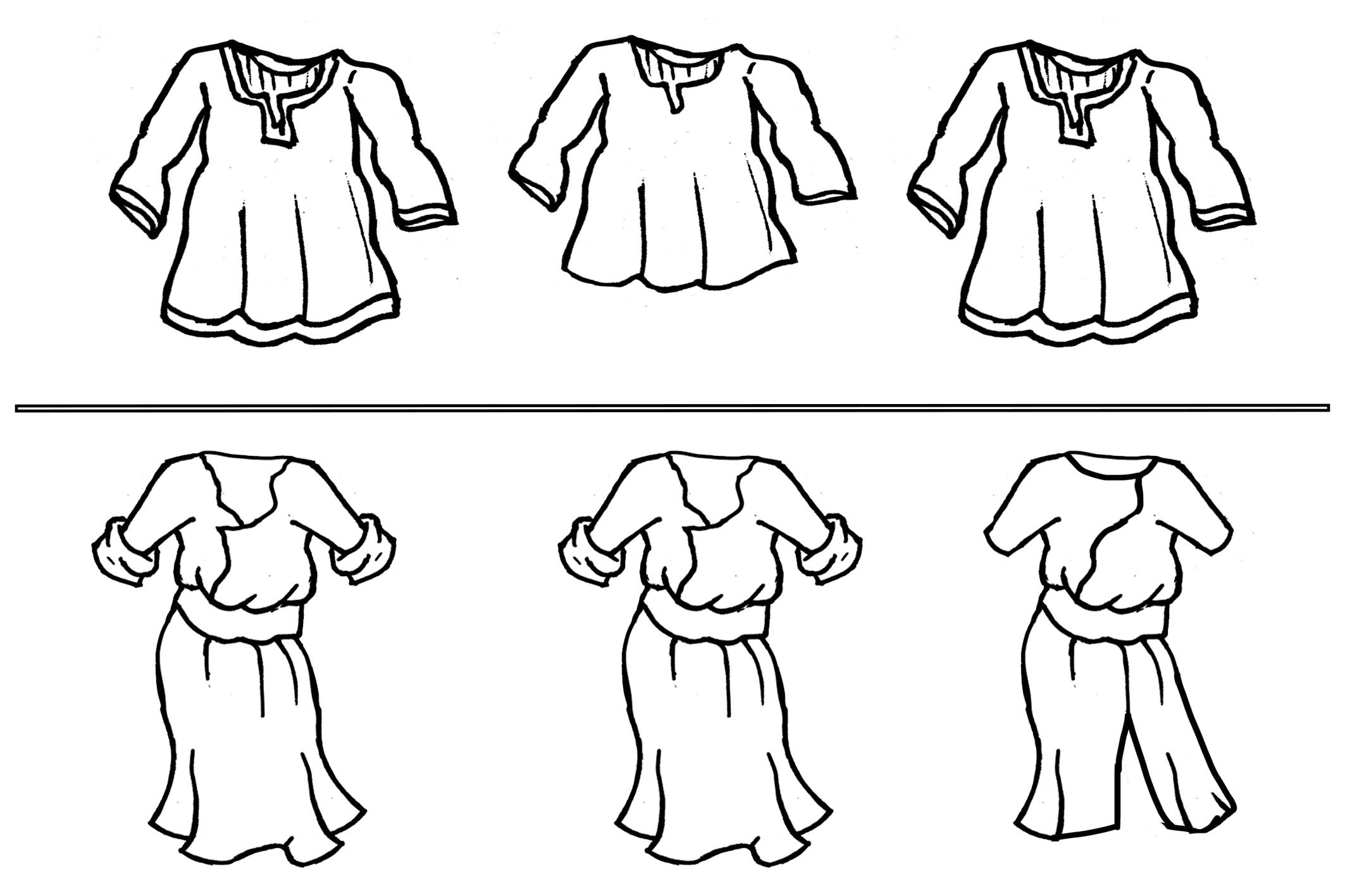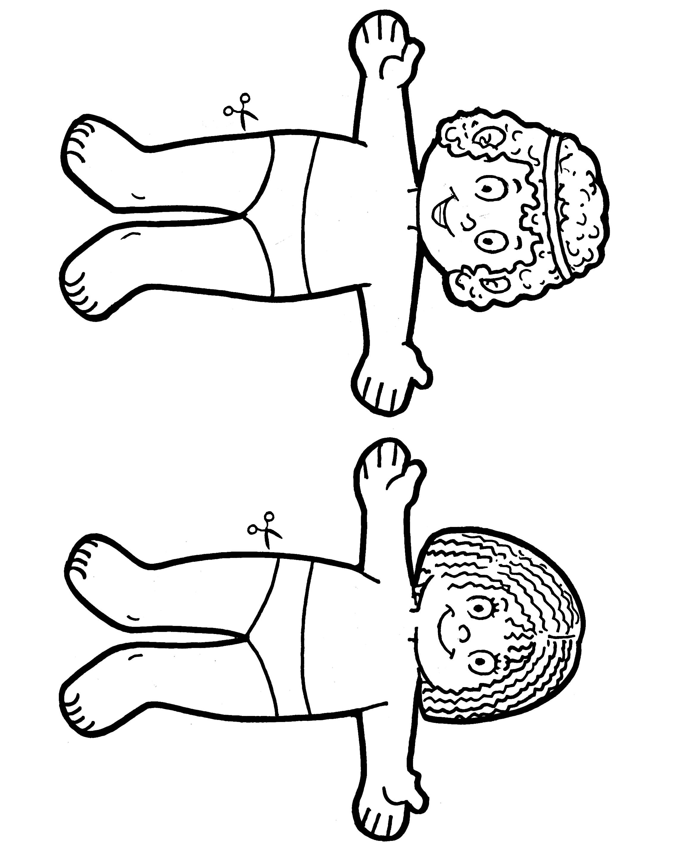 Colorea y recorta los muñecos y las ropas. Jugad a que son las ropas hechas por Dorcas para las familias necesitadas. No os olvidéis de dejar las pestañas un poco más largas de lo que marca el dibujo para que luego el vestido quede bien prendido al muñeco.