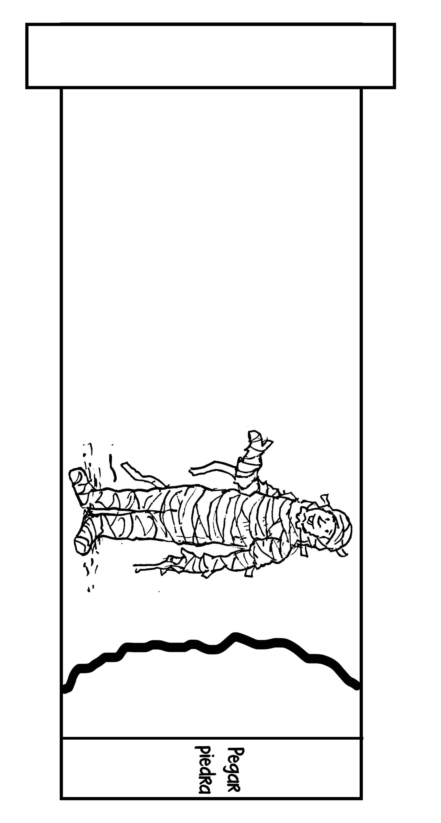 Introduce la tira de Lázaro por las aberturas de las líneas punteadas de forma que la solapa más ancha quede en el exterior. Pega la piedra en el lugar indicado solo en la tira de Lázaro.