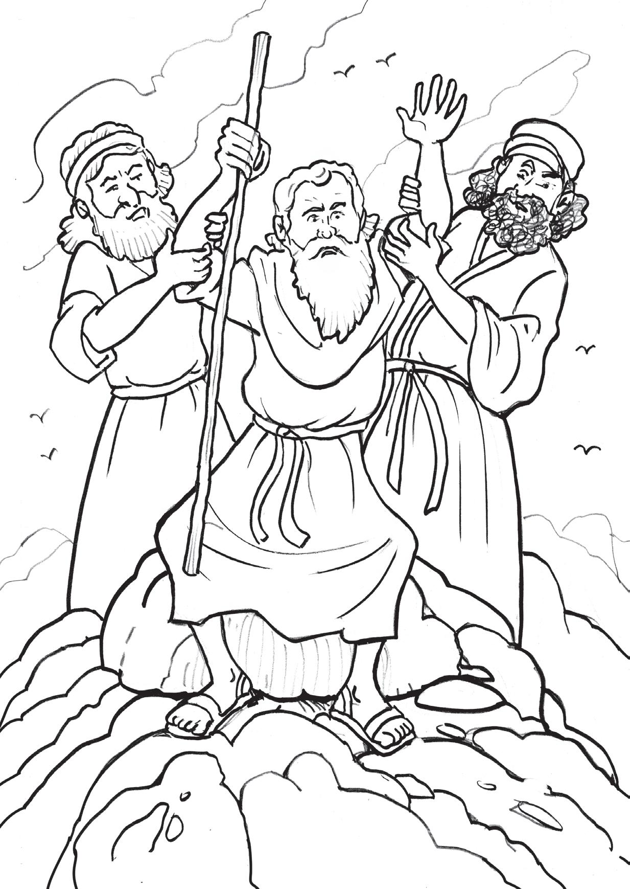 Moisés confiaba en que Dios iba a defenderlos de los amalecitas. A la mañana siguiente, Moisés subió a una la montaña cercana con la vara en la mano. Aarón y Hur le acompañaron mientras Josué y sus hombres estaban en el valle. Cuando los amalecitas atacaron, Moisés levantó sus manos hacia el cielo para orar por su pueblo. Sabía que los israelitas necesitaban la ayuda de Dios pues solo Dios podía librarlos de los amalecitas. Mientras Moisés mantenía sus manos en alto los amalecitas no tenían fuerza para ganar a los israelitas. Pero cuando se cansaba bajaba los brazos. ¿Qué sucedía entonces? (Léelo en Éxodo 17:11)