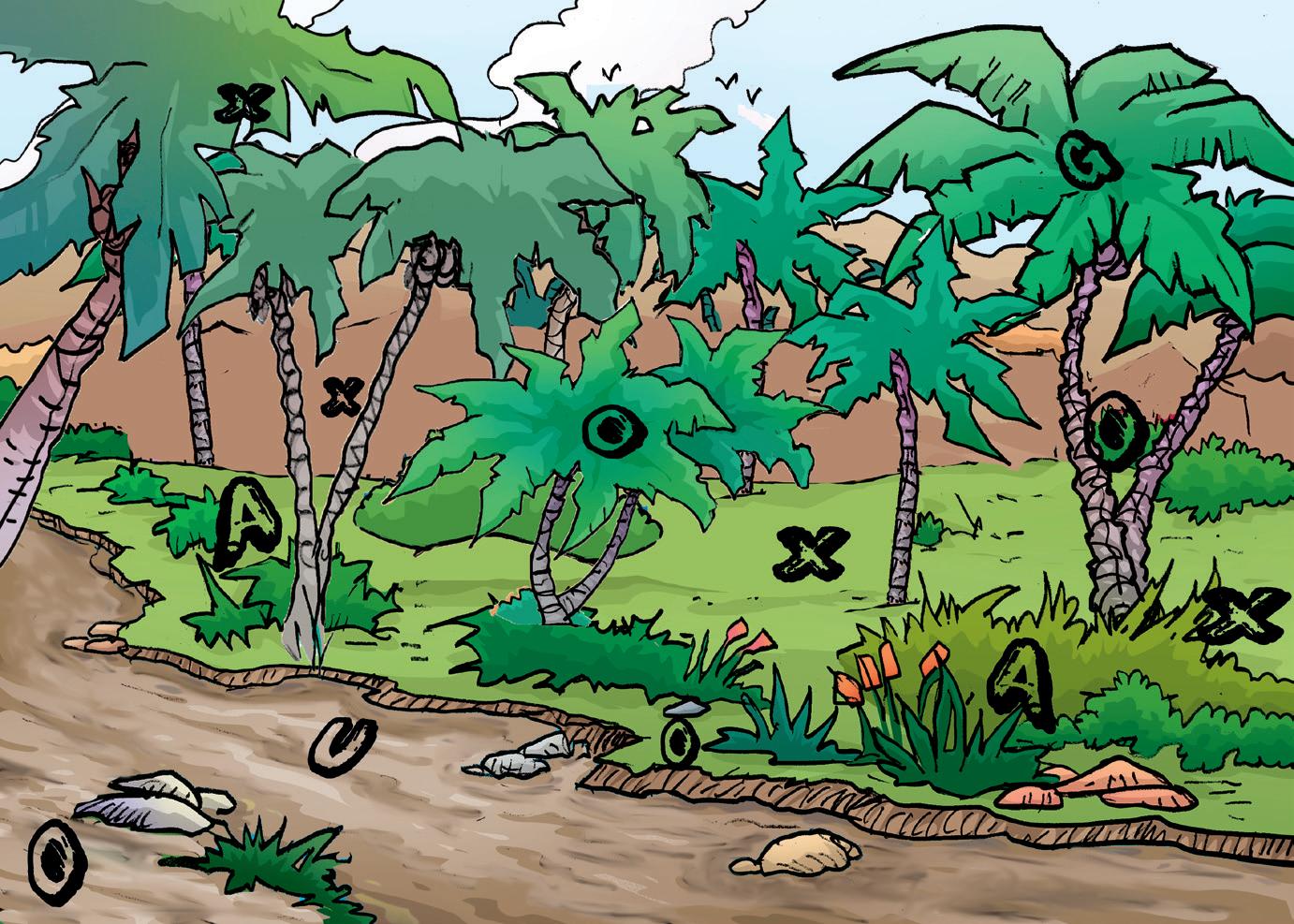 • Busca las letras escondidas en el dibujo, ordénalas y sabrás qué le falta a este oasis. No tengas en cuenta las letras O y X.