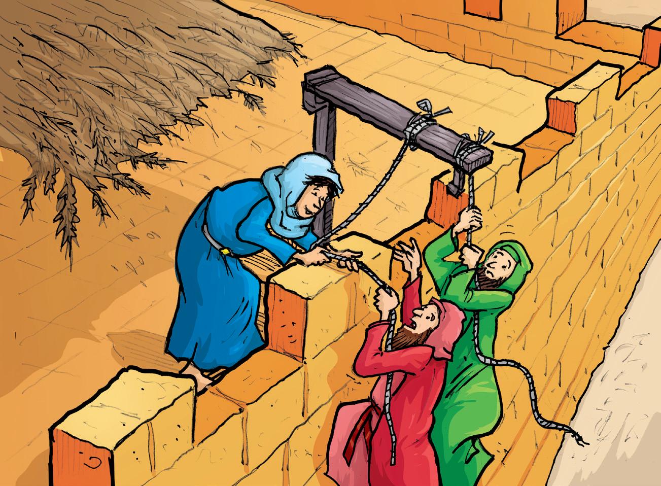 Rahab tuvo entonces una idea. Su casa formaba parte de la muralla, así que consiguió una cuerda para que pudieran descolgarse por la muralla. Luego les aconsejó a dónde ir. Ella conocía bien la zona y sabía que los soldados los buscarían camino del Jordán. Les dijo que se escondieran tres días en el monte y que luego regresaran al campamento.