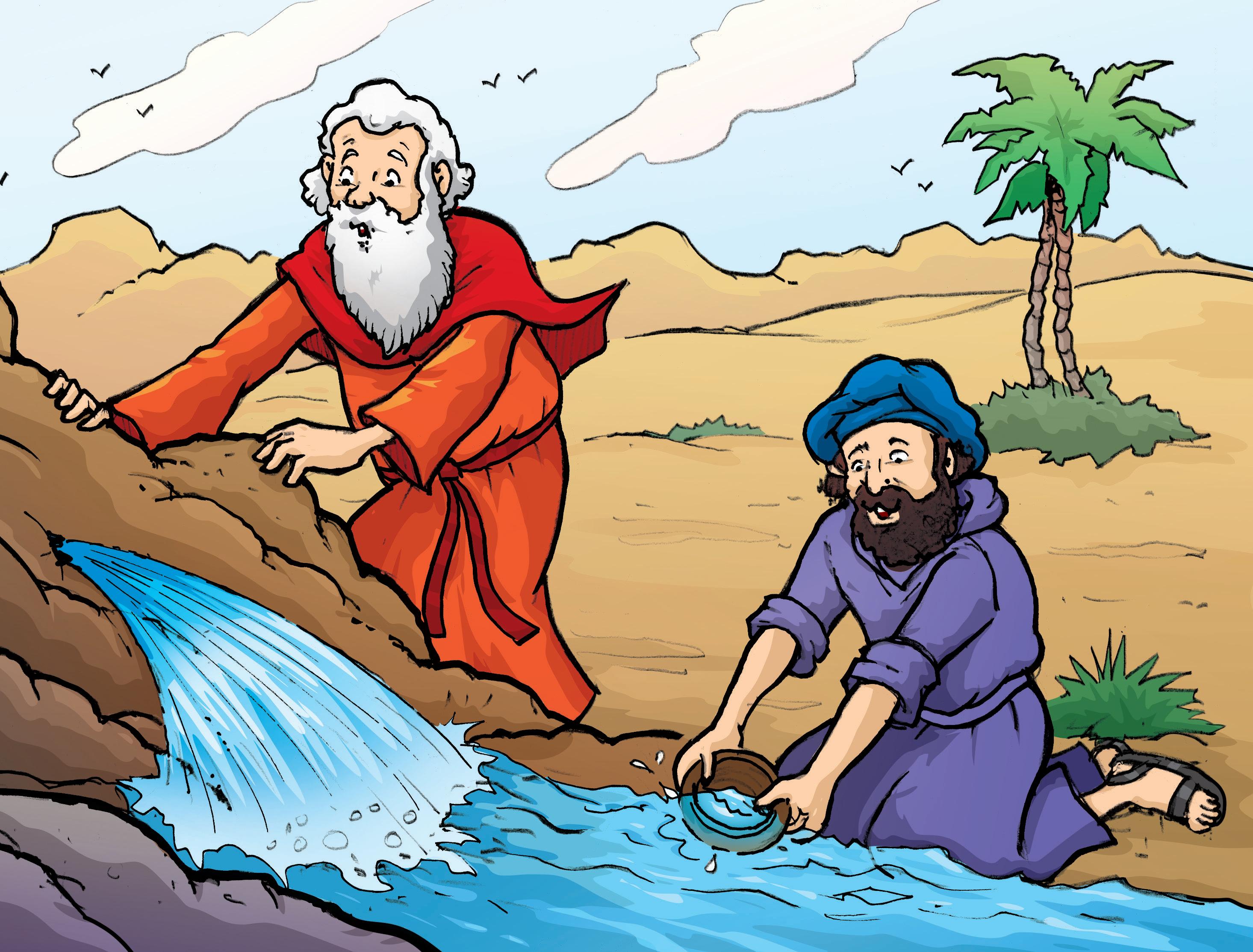 Los israelitas se habían quedado sin agua otra vez. ¿Qué harían ahora? Seguramente el oasis más cercano estaba muy lejos de allí. No podían mandar a nadie a buscar agua para tantísima gente. Pero Moisés confiaba en Dios. Cada vez que Moisés tenía un problema se lo contaba a Dios. ¿Qué le dijo Dios a Moisés esta vez? (Lee la solución de Dios en Éxodo 17:5,6).