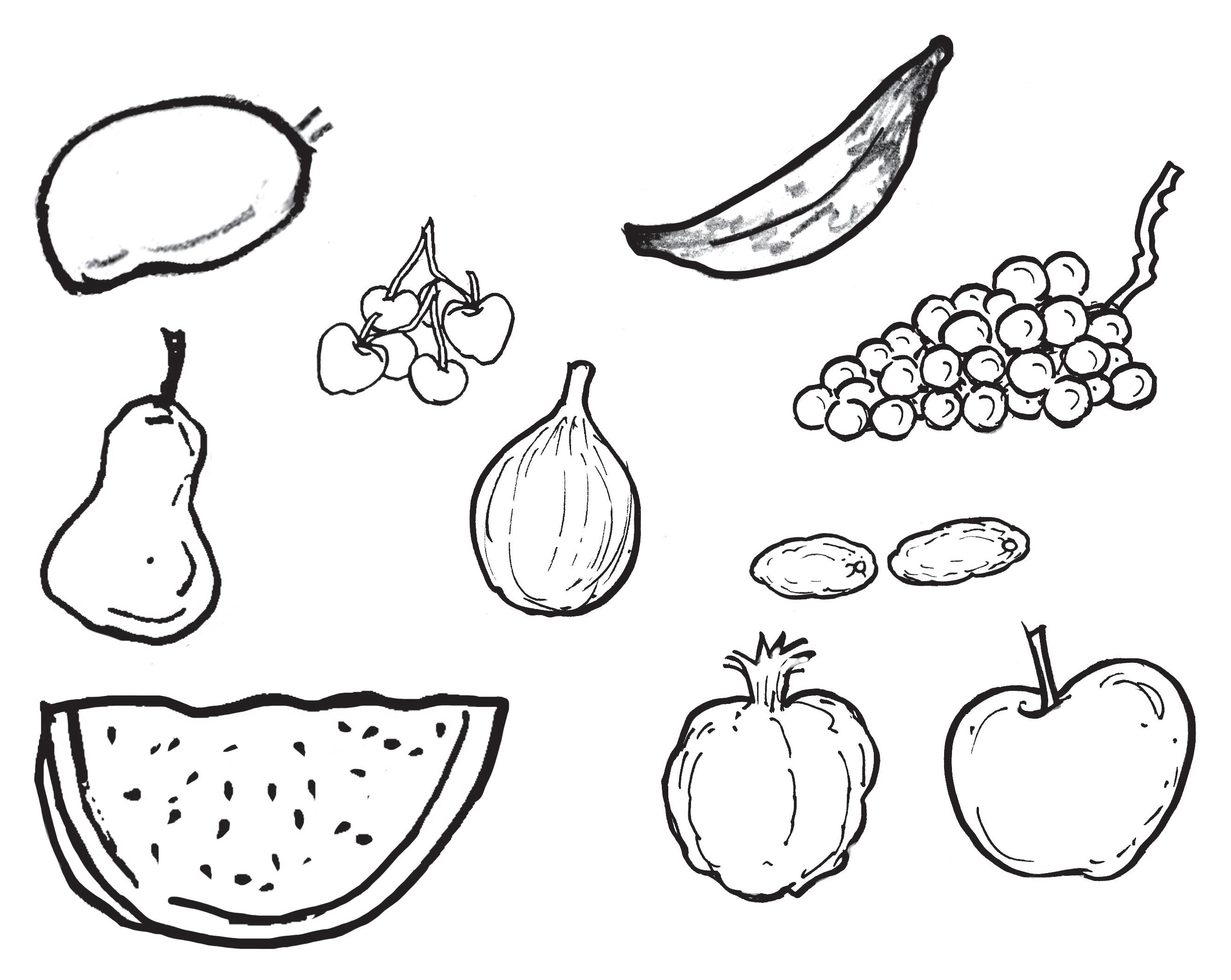 • Vamos a leer otra vez el texto de arriba en tu Biblia. Escribe en cada fruta una característica del fruto del Espíritu según las palabras de tu Biblia.