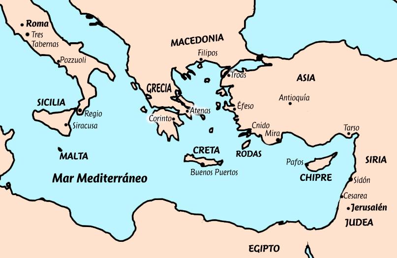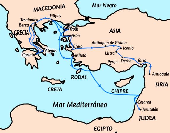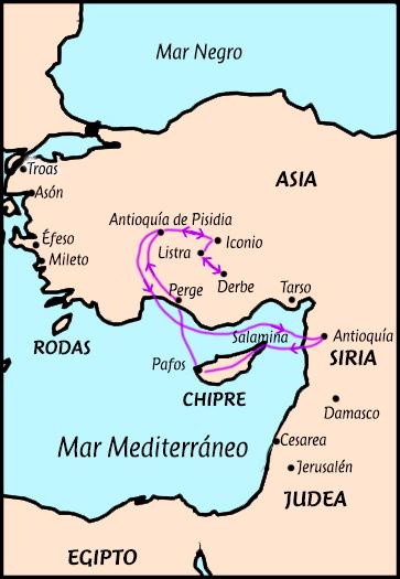 Saulo y Bernabé comenzaron a viajar por varios lugares en los que no había cristianos. Su viaje era un viaje misionero. Juan Marcos los acompañaba. Cuando llegaron a Chipre buscaron las sinagogas para hablar con los judíos que vivían allí. Muchos judíos creyeron en Jesús y se convirtieron en cristianos.
