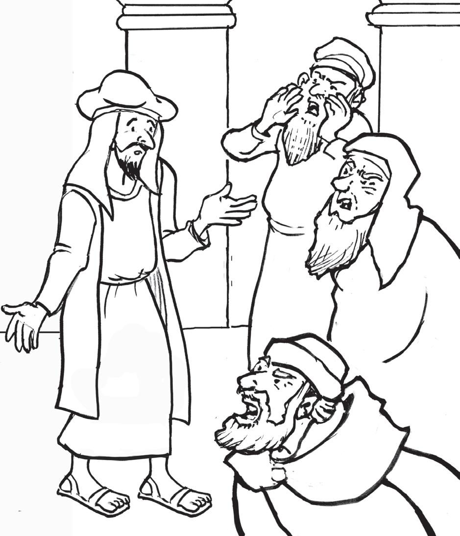 Ahora Elimas no podía presumir más de ser tan poderoso. Él hacía milagros falsos, pero de repente se quedó ciego, de verdad. Elimas estaba asustado. No podía ver nada y hasta le tuvieron que ayudar para que no chocara con las paredes. ¿Quién era ahora el poderoso? Elimas no podía hacer nada para volver a ver.