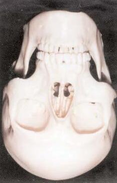 Las diferentes proporciones entre tamaño cerebral y esqueleto facial destacan en gran medida las diferencias de los cráneos en vista de perfil. La codominancia entre neurocráneo y cara en los monos antropomorfos da paso al mayor predominio absoluto del neurocráneo en el hombre, reduciendo la proyección de la cara hasta llegar a ser perpendicular en muchos humanos actuales (véase figura 2.2). La línea de base del cráneo es diferente en el hombre respecto de monos y australopitecinos. En estos últimos, esta línea que une el prostion, punto del maxilar situado entre los dos incisivos centrales, con el agujero occipital presenta sólo un escalón, que sitúa a diferente nivel prostion y agujero occipital, en tanto que en el hombre presenta una línea más quebrada, debido a que el foramen magnum se alinea con el pros-