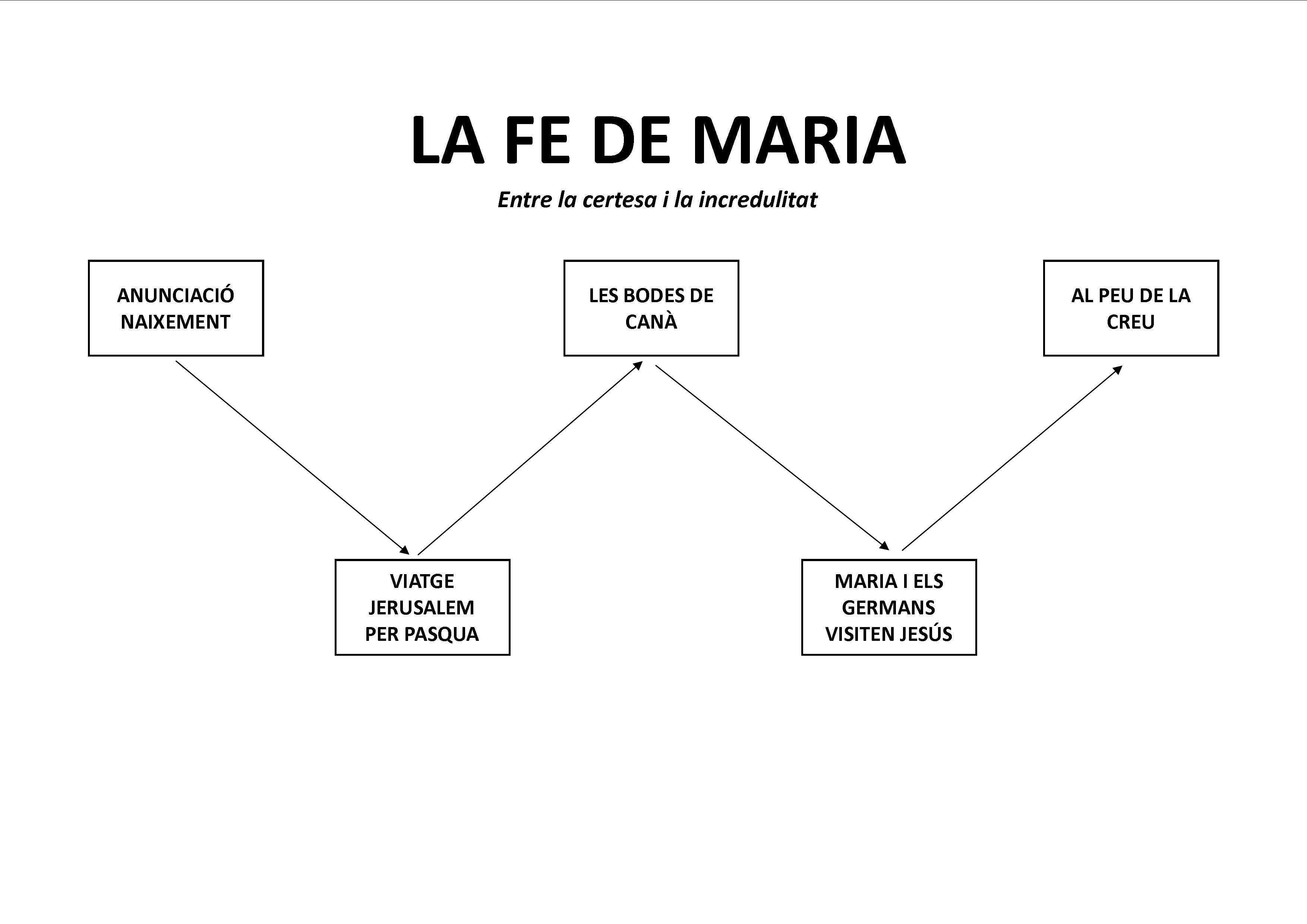 En aquest sentit, la vida de Maria i al mateix temps la seva fe la podem sintetitzar o analitzar, segons el meu parer, a travĂ©s de cinc episodis dels quals ens parlen els evangelis. PodrĂem fer una analogia amb una obra en cinc actes. Aquests serien: